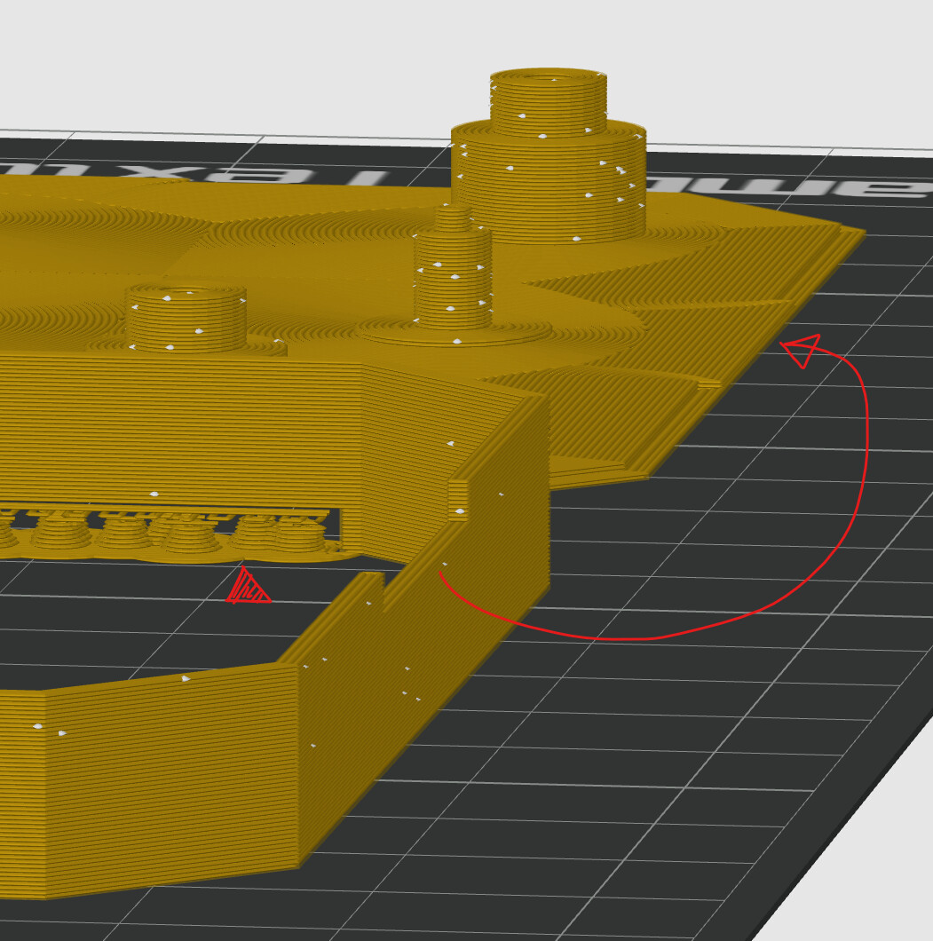 I made sure my modelling dimensions were multiples of 0.2mm vertical and 0.4mm horizontal, for neat slicing. Case walls are 1.2mm thick. The top is all one piece, but the bottom has to be printed in two parts in order to get the dials onto their shafts first. The sides register into a rebate on the top/bottom for a clean fit. Seam is set to random to avoid a noticeable line. The only overhang support in the whole job is the slot for the hinge in the bottom case side wall.