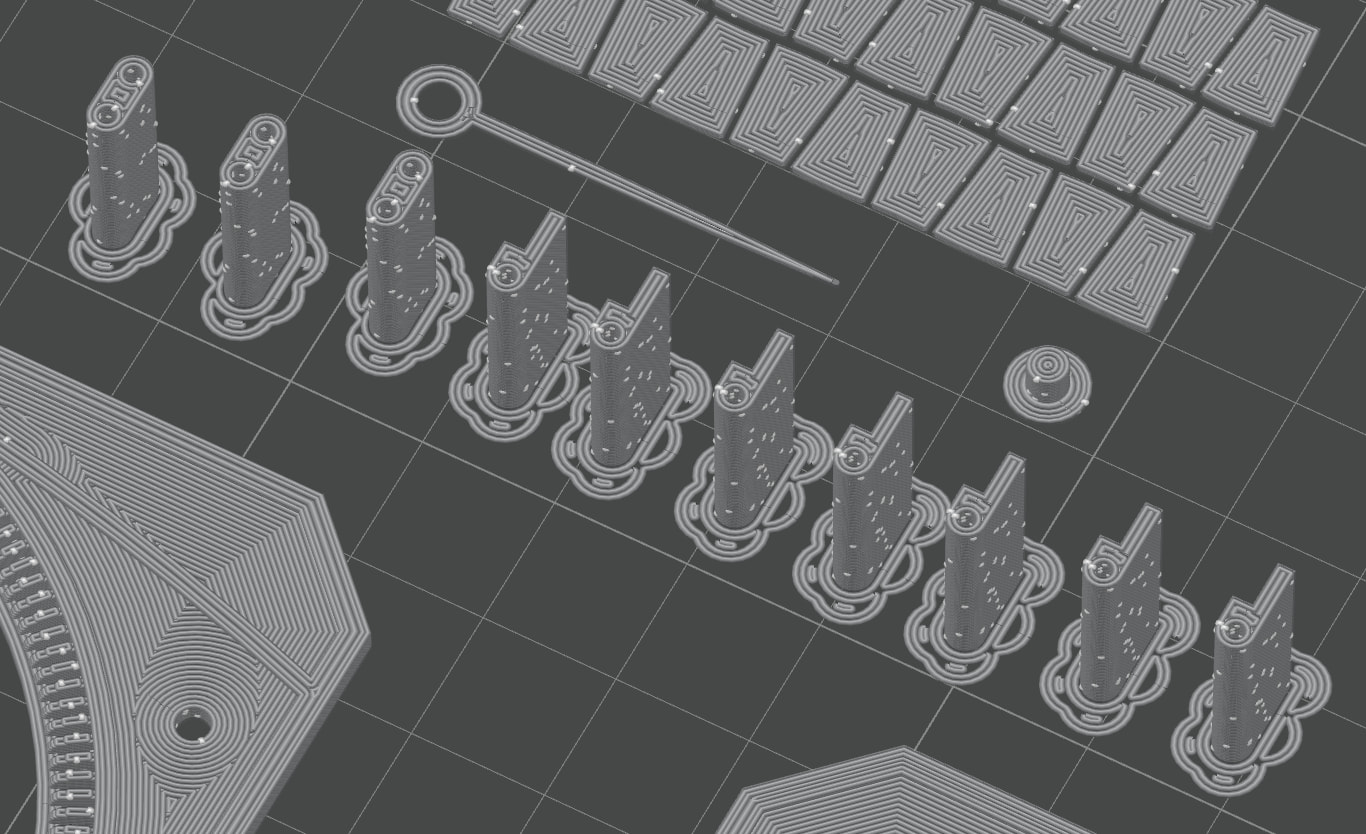 The 36 answers are 3D printed as little tiles which I’ll glue laser-printed symbols onto and press into place.