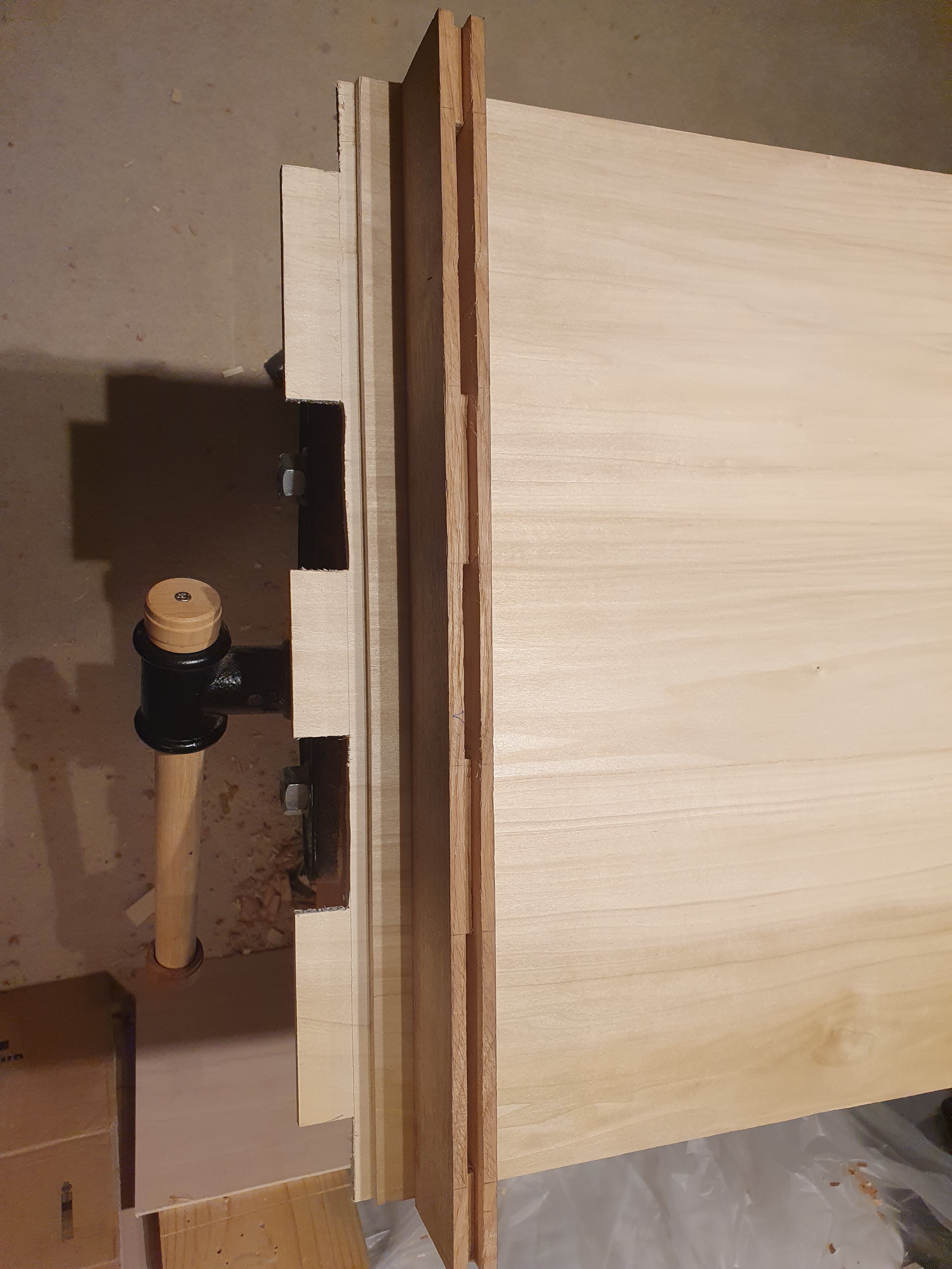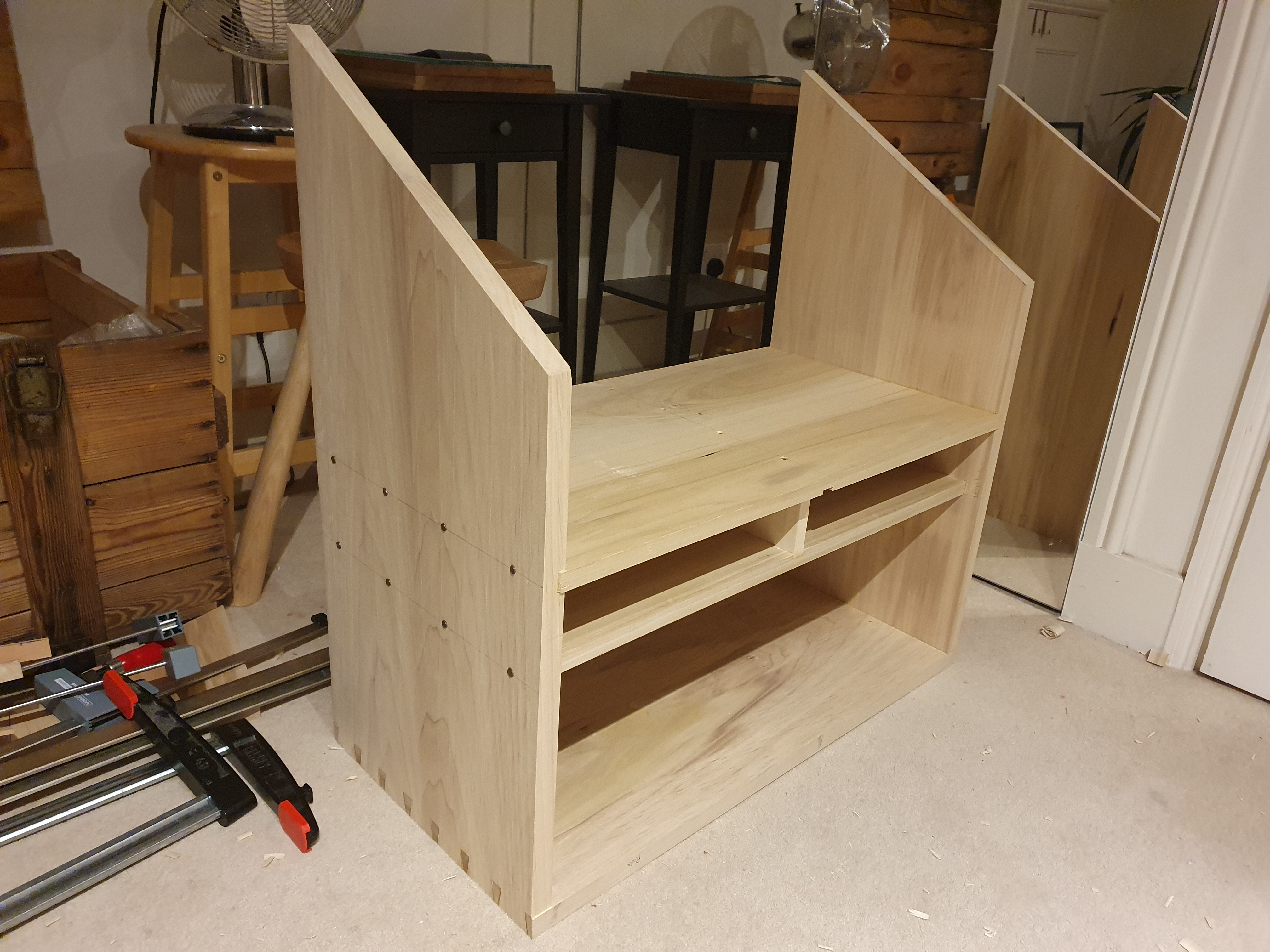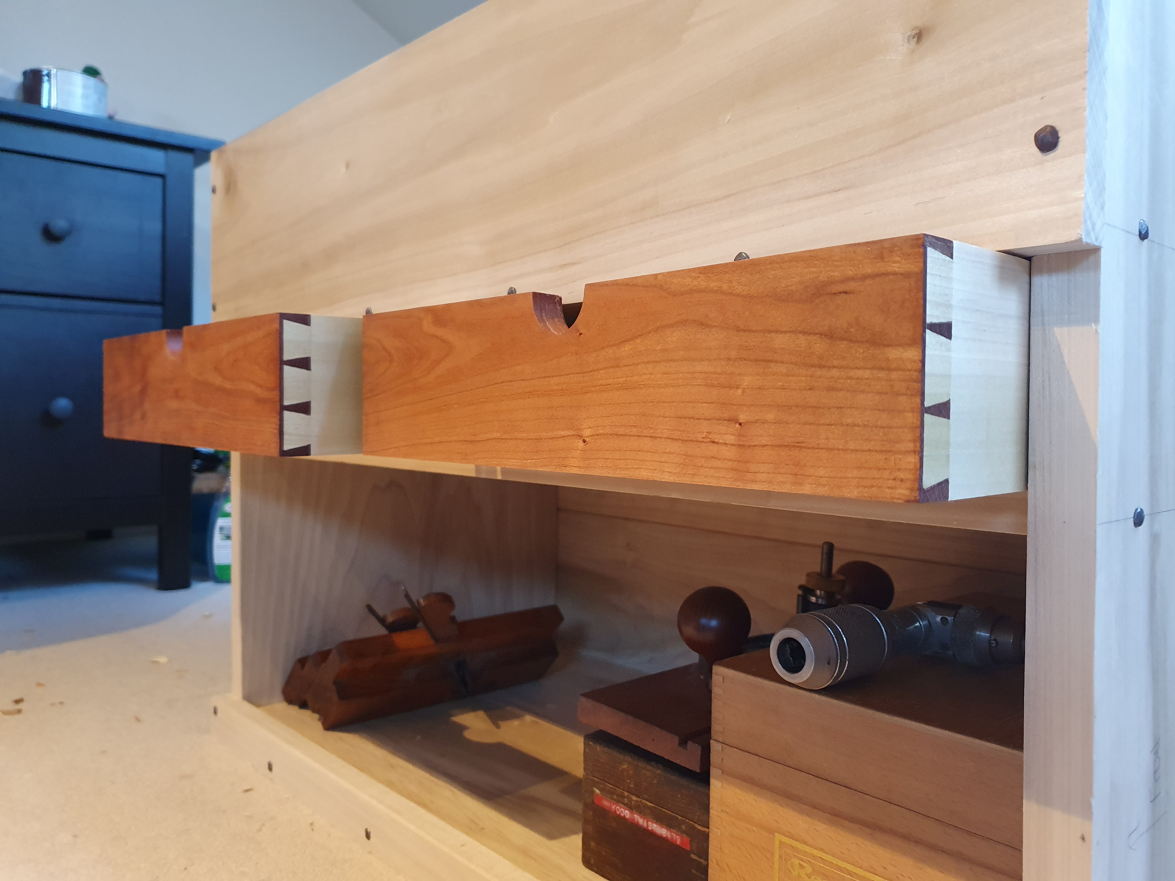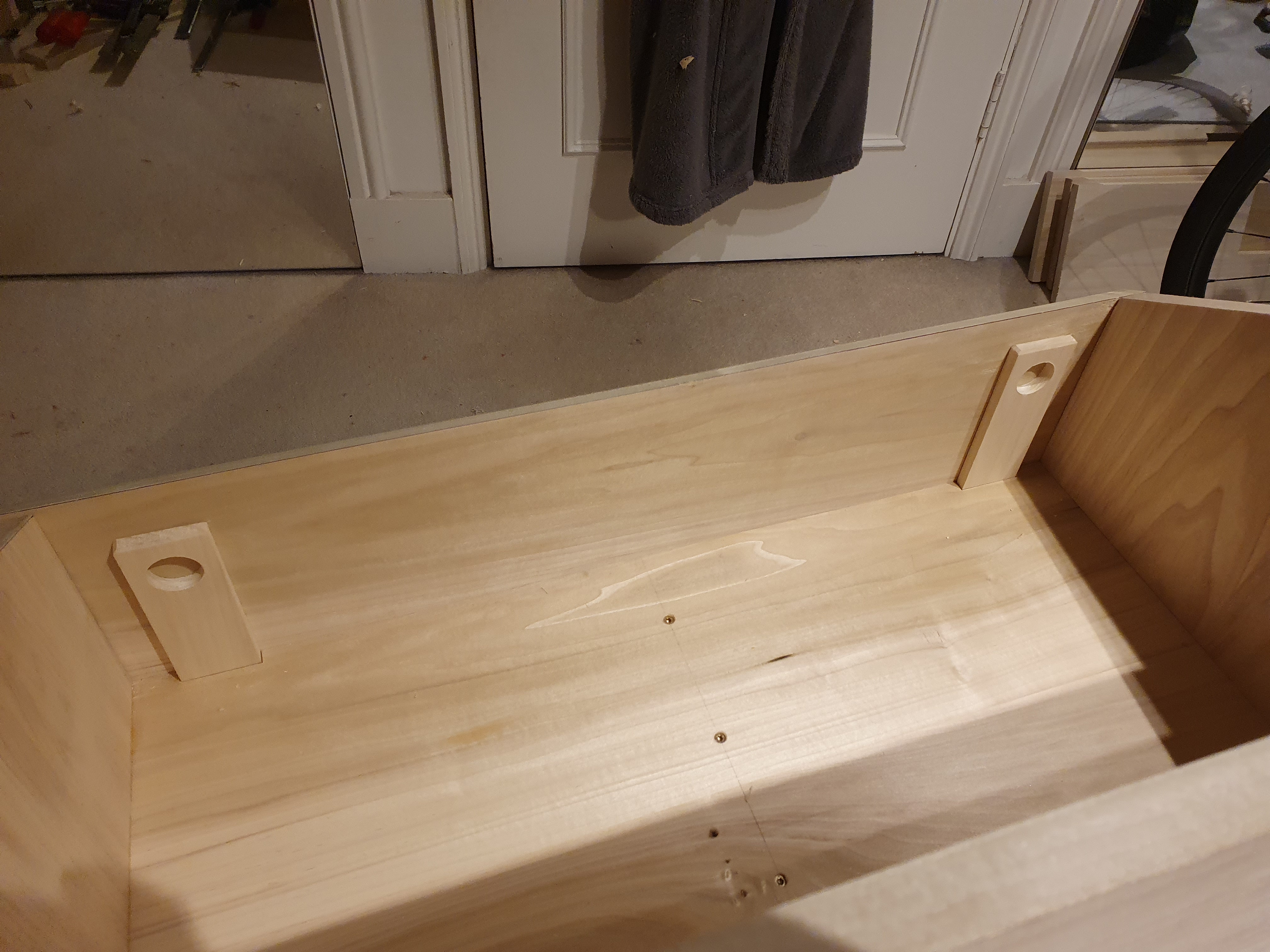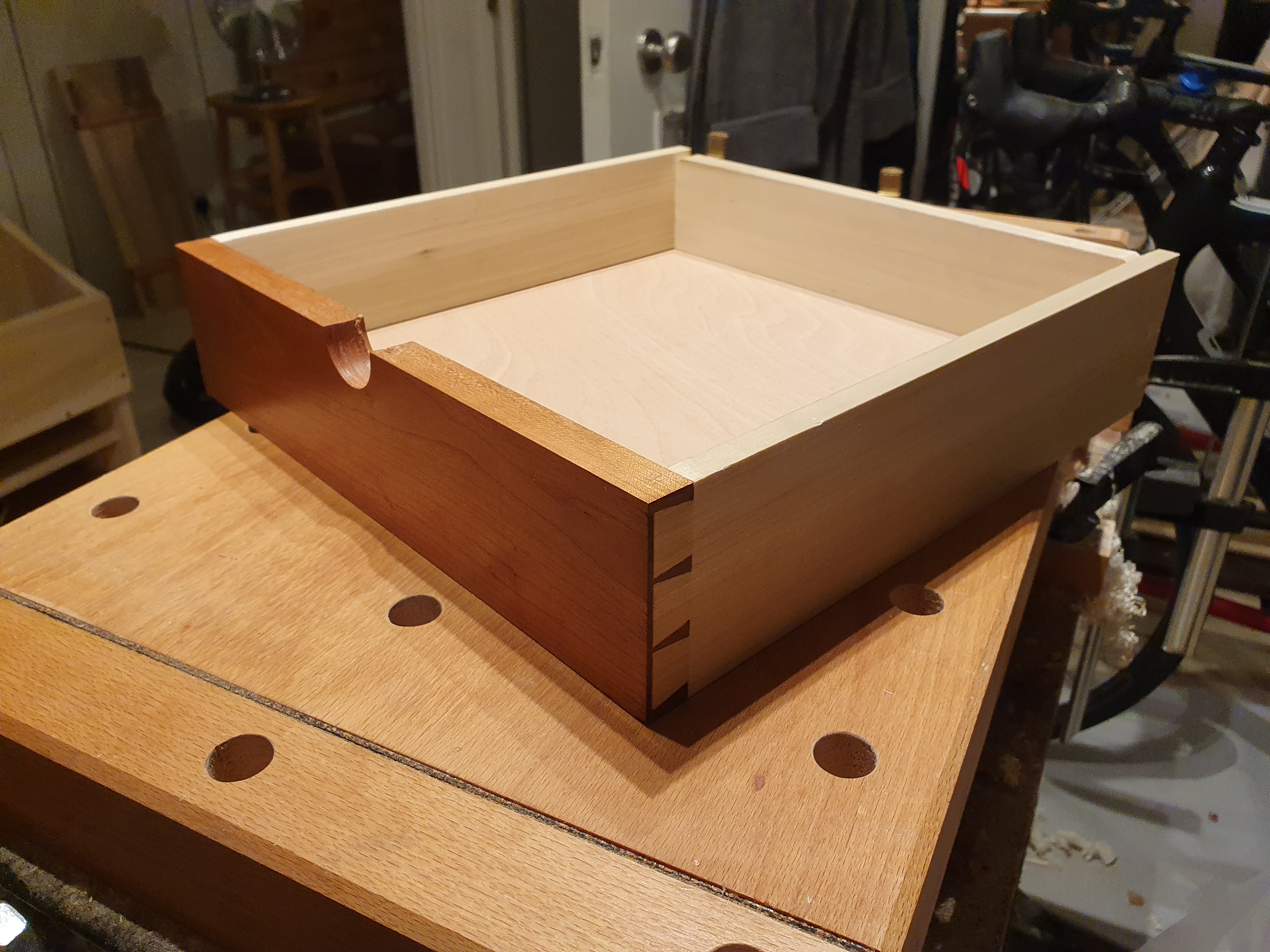 Got frustratingly little done this weekend but I finished the first drawer at least. First time doing half blinds and happy with the result. One major fail hit towards the end when I drilled the finger hole (which I definitely should have done earlier in the process). I should have used a sacrificial block so that the drill had nowhere to slip, I didn’t, it did. It cause some regrettable damage but I glued the chips back in and the repair isn’t noticible from the front. Oh well, all a learning experience.