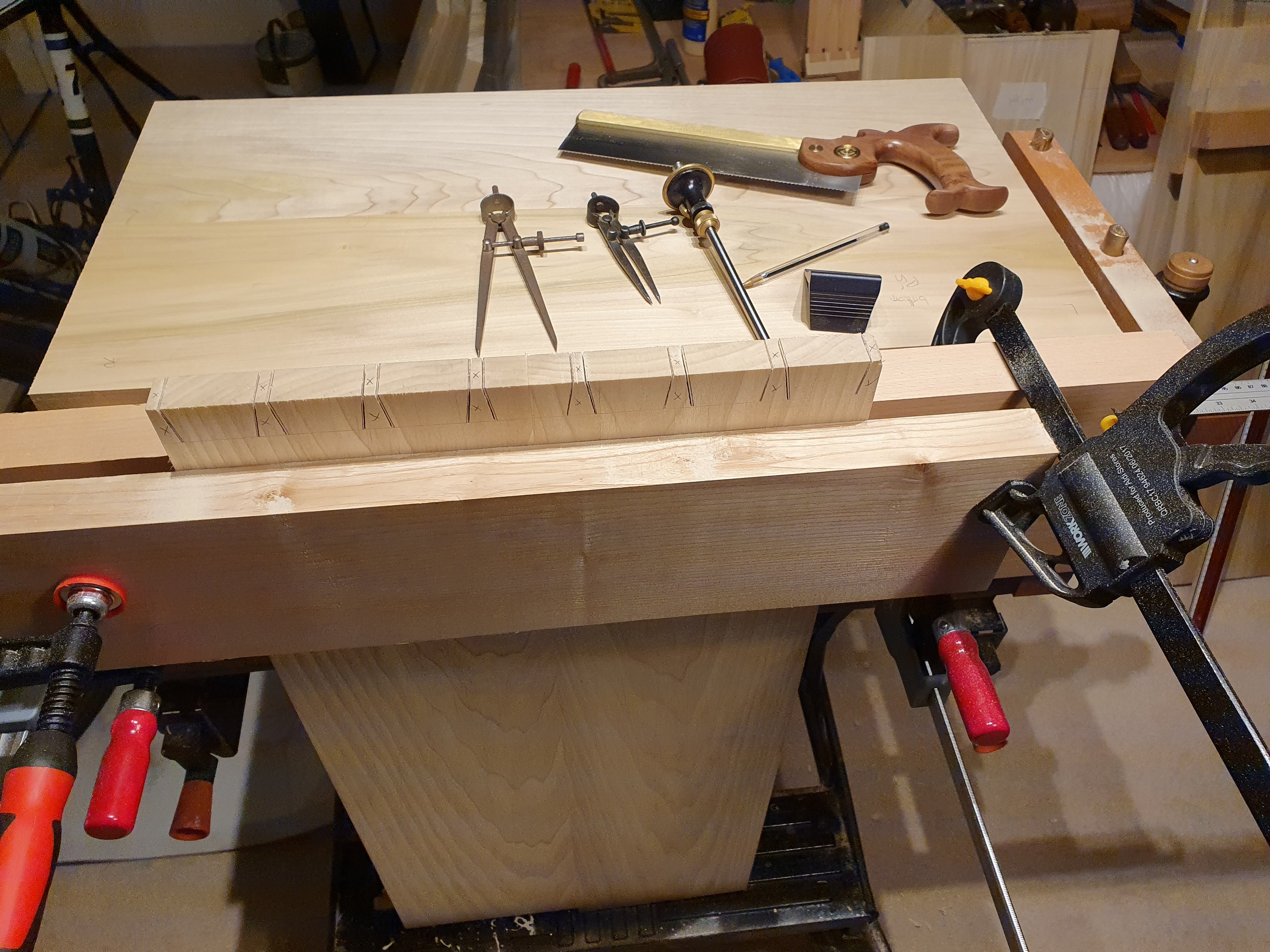 Then onto dovetails for the bottom corners. Here to make it easy with the wide panels I rigged up a Moxon-like setup with some spare wood and some clamps. It worked really well and I’m thinking I may have to make a less hacky version as an add on to my mini bench.