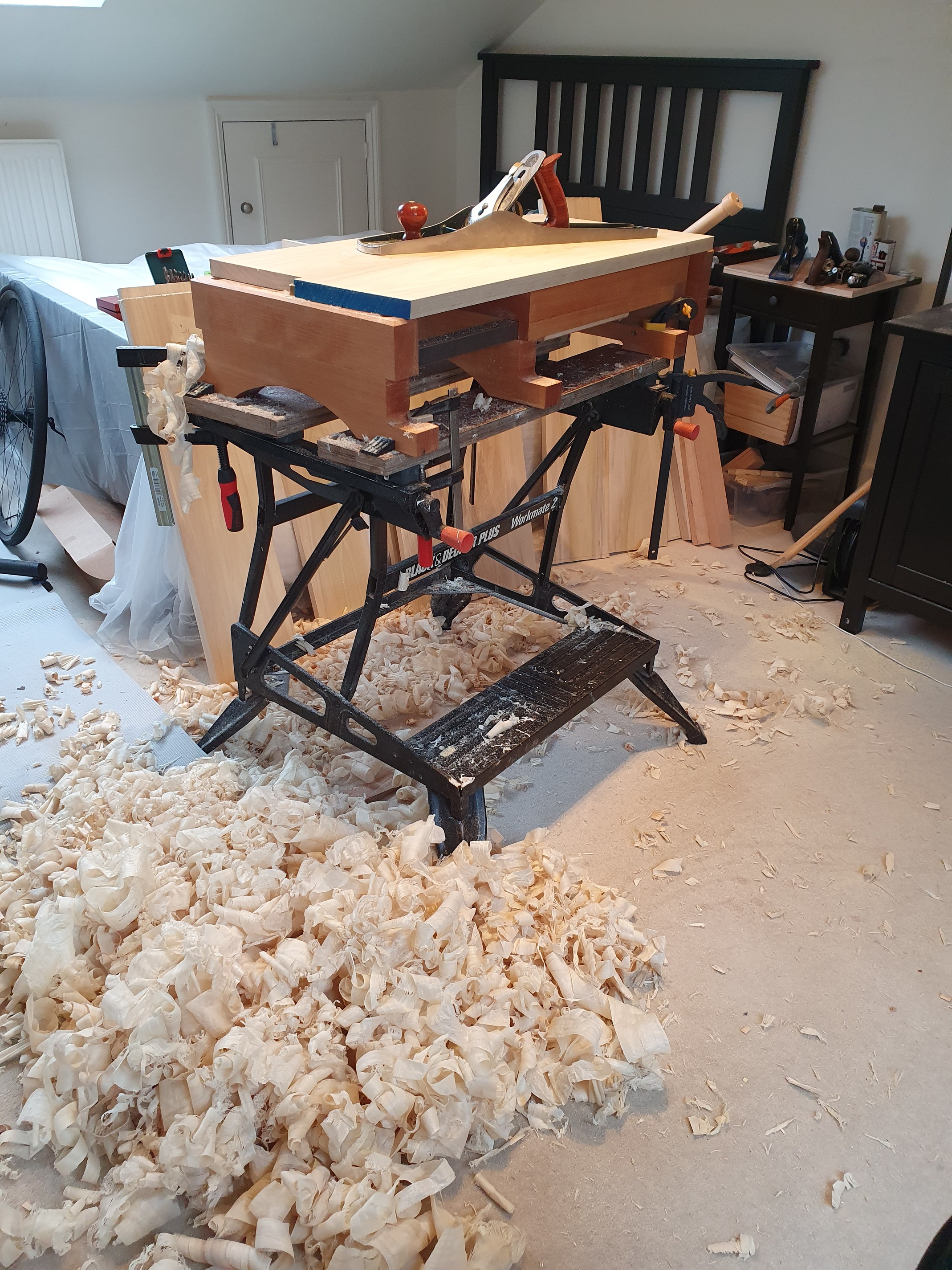 First up was joining my boards for first few sections and then flattening and thicknessing the resultant panels. I’m using the mini workbench I made with the extension out which gave enough room between dogs for the length I was working with. I’d love a bigger bench but this beats the workmate for workholding hands down.