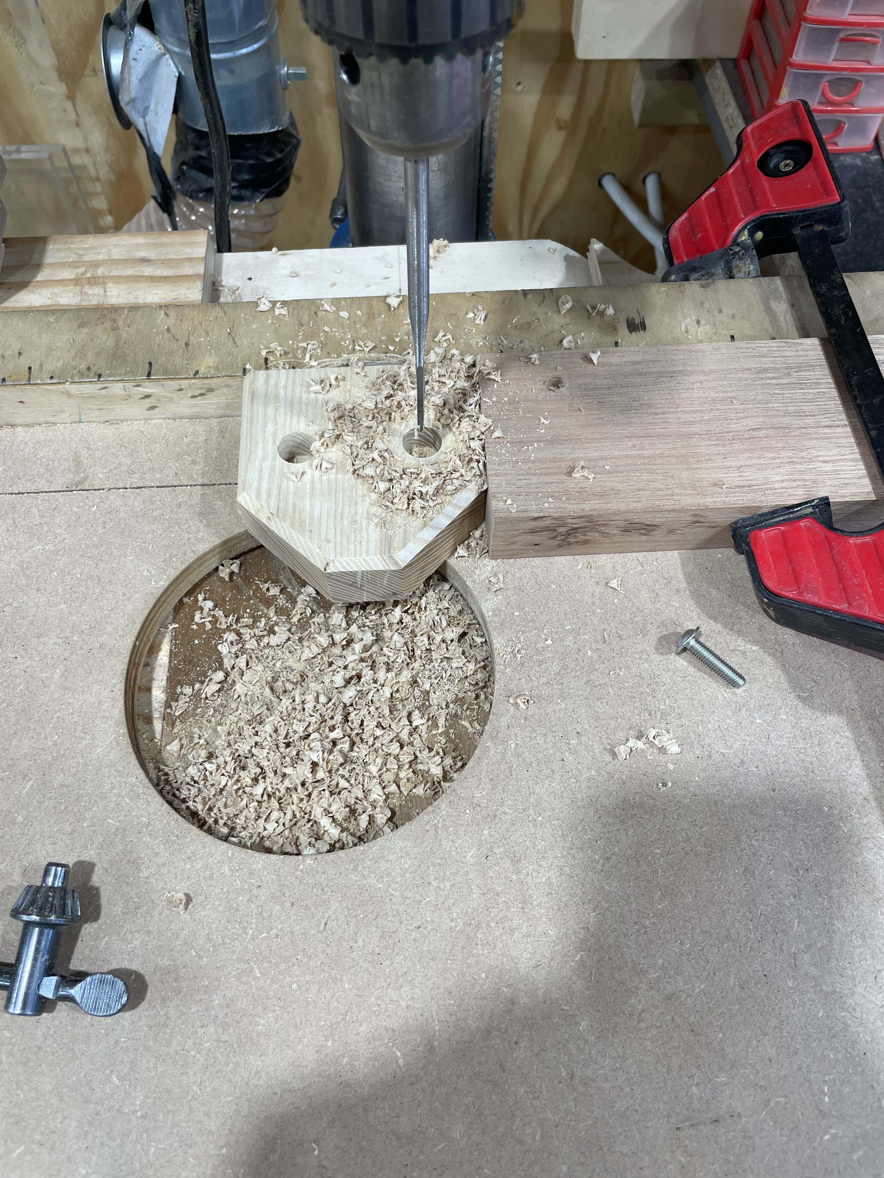 After measuring my bolts and threaded inserts, I used the depth stop and a stop block to drill large holes with a spade bit, then smaller holes with a diameter a few mm larger than the bolts all the way through the block.