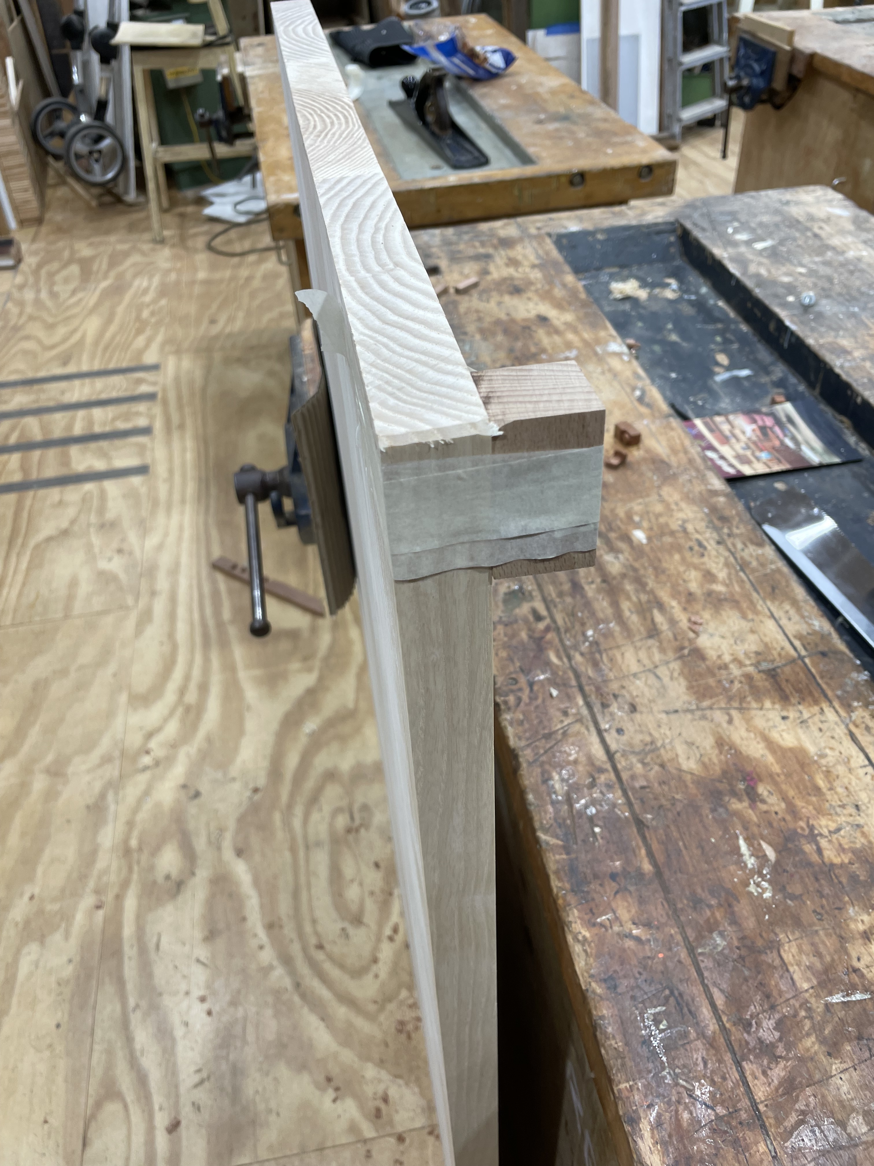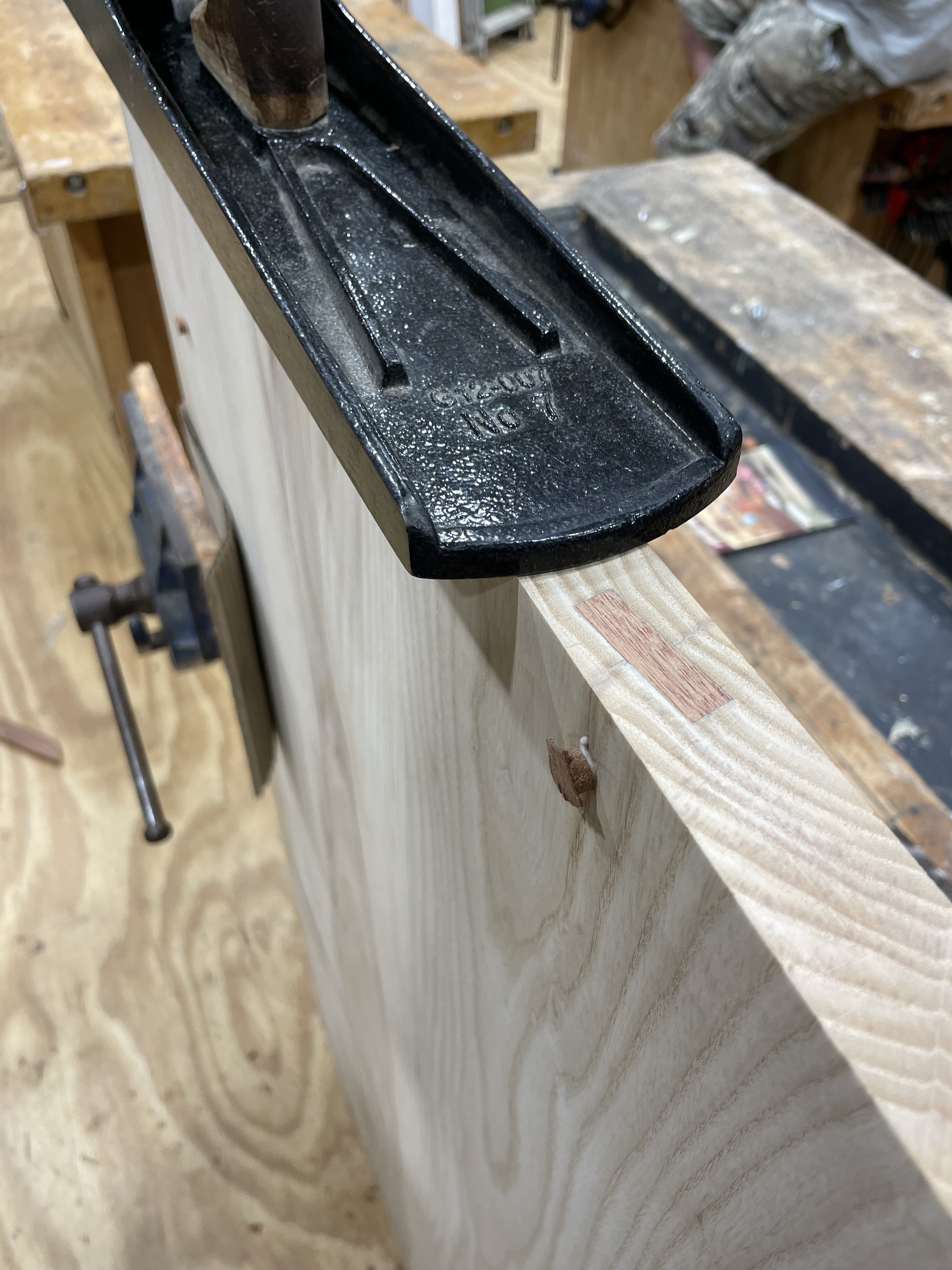 After cutting the boards in half and running them through the planer/thicknesser, I touched it up by hand. Panel joins are particularly hard, as you need the touching edges to be as perfectly flush as possible. This process was putting the touching edges on top of each other, making a few strokes with the planer, then checking again, over and over: