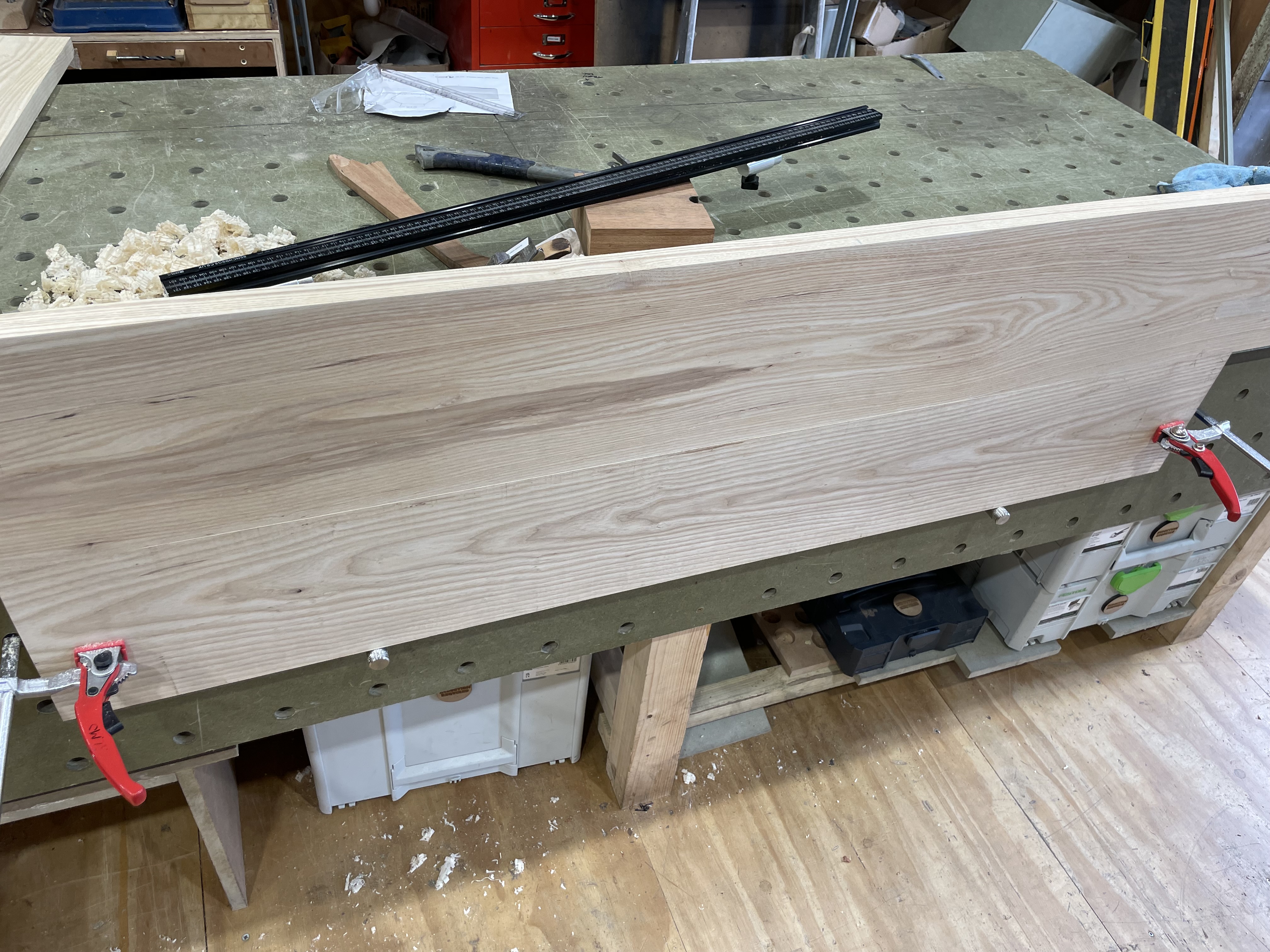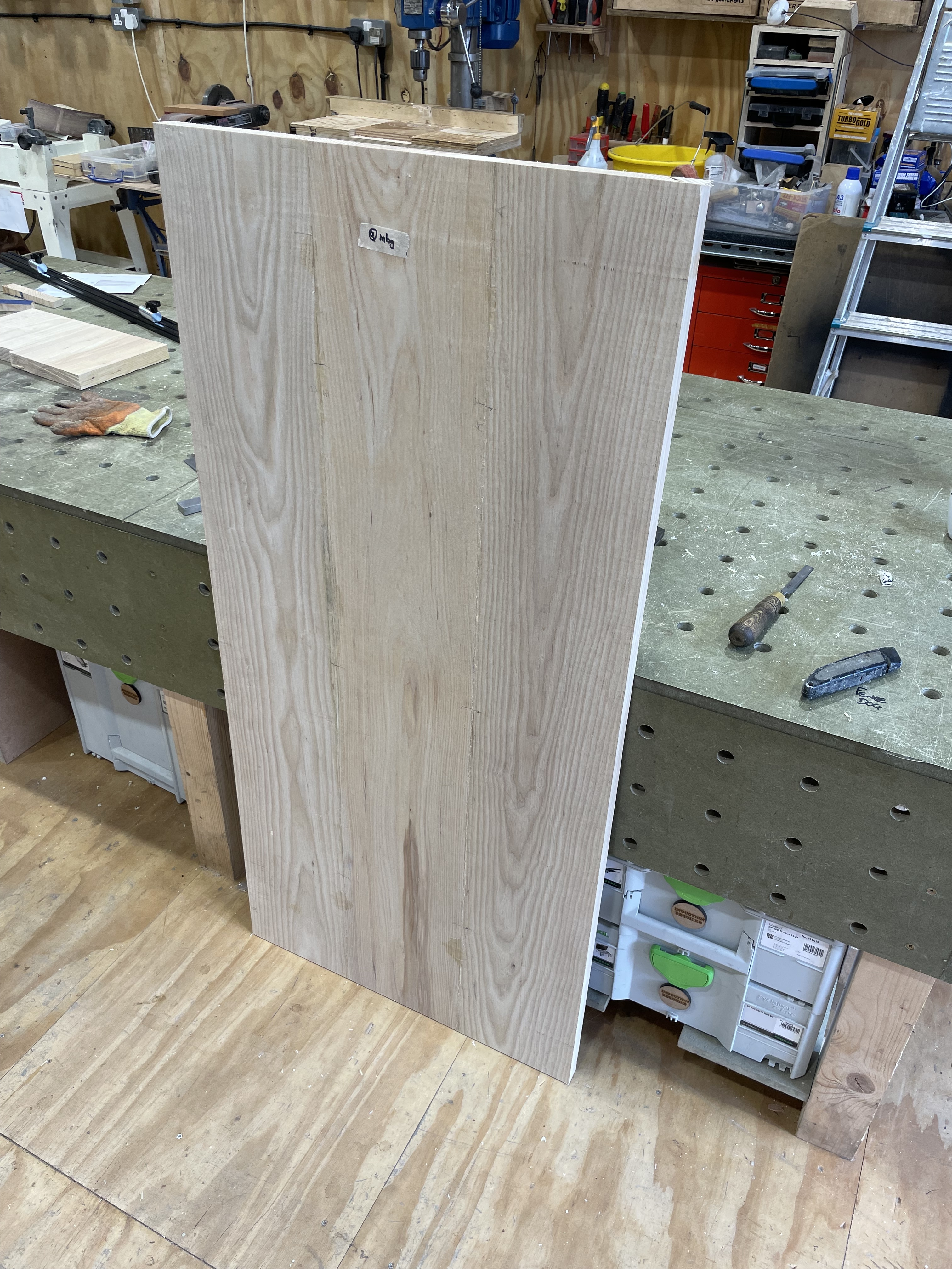 Last year I made a nice beech desktop for a standing desk frame, this is a very similar project, just made using ash instead: Beech desktop for standing desk frame