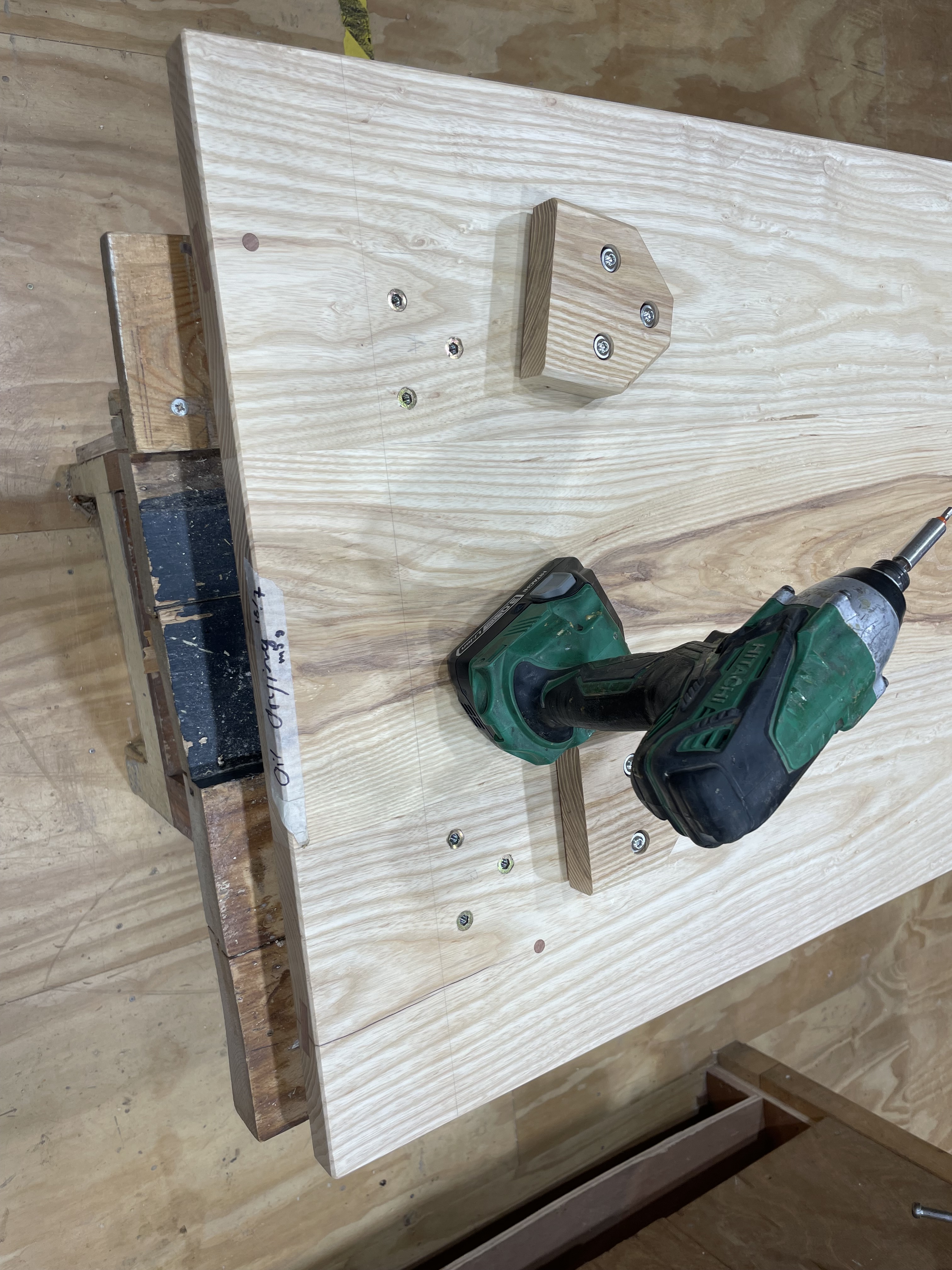 Next up was making the clamps that will hold the desktop to the frame. I used scraps from the desktop build. One edge was already fly and square from the table saw, I and rough cut them to size on the band saw, then made them square-ish with a hand plane. Since there was no real joinery involved with these, the exact size didn’t really matter. The 45 degree cuts were traced out, cut free hand in the band saw, then planed flat. The chamfer along the top was done with the trim router. The slight recess on the clamping edge was done with the router table. Next up was drilling holes with the drill press: