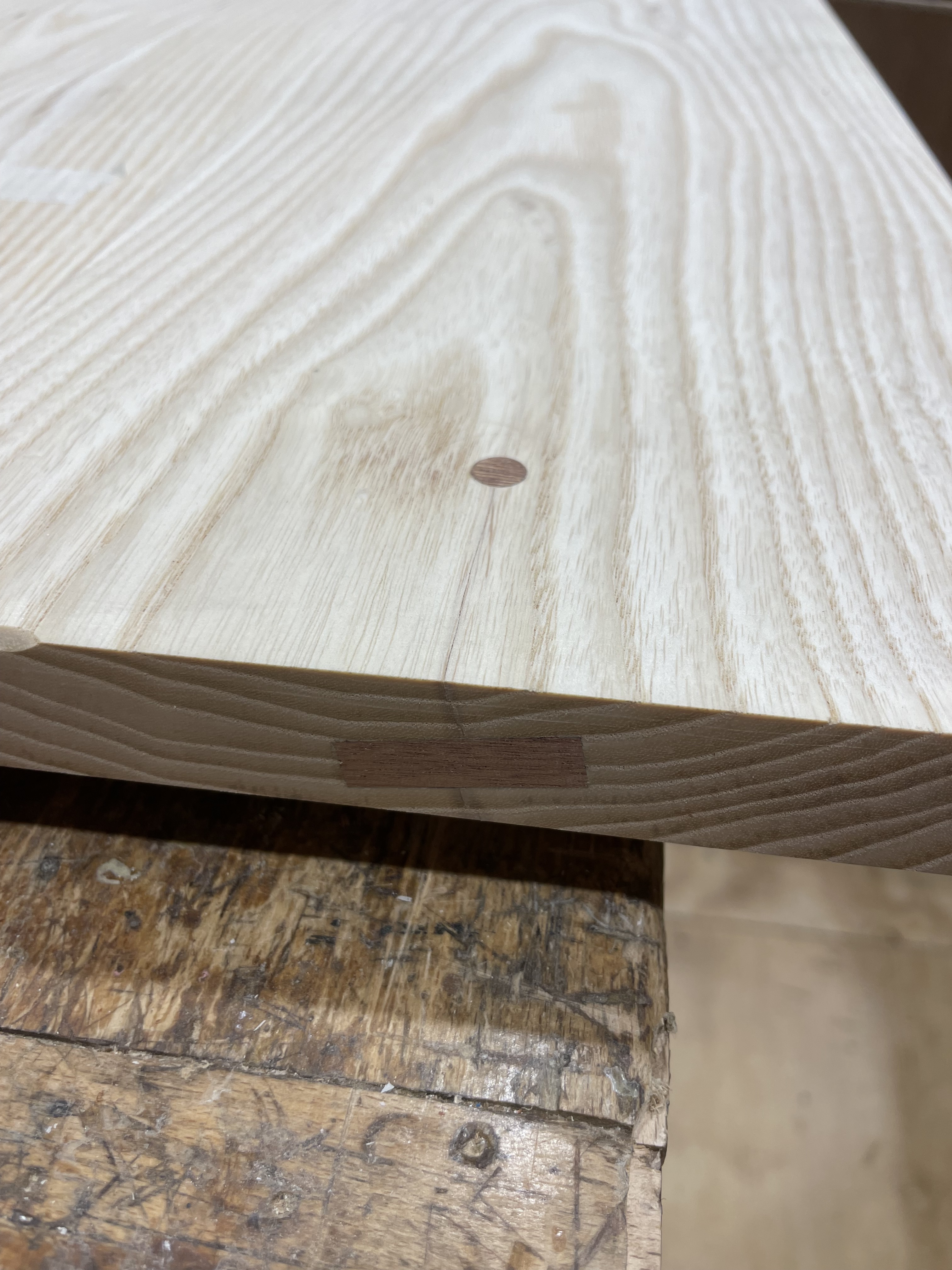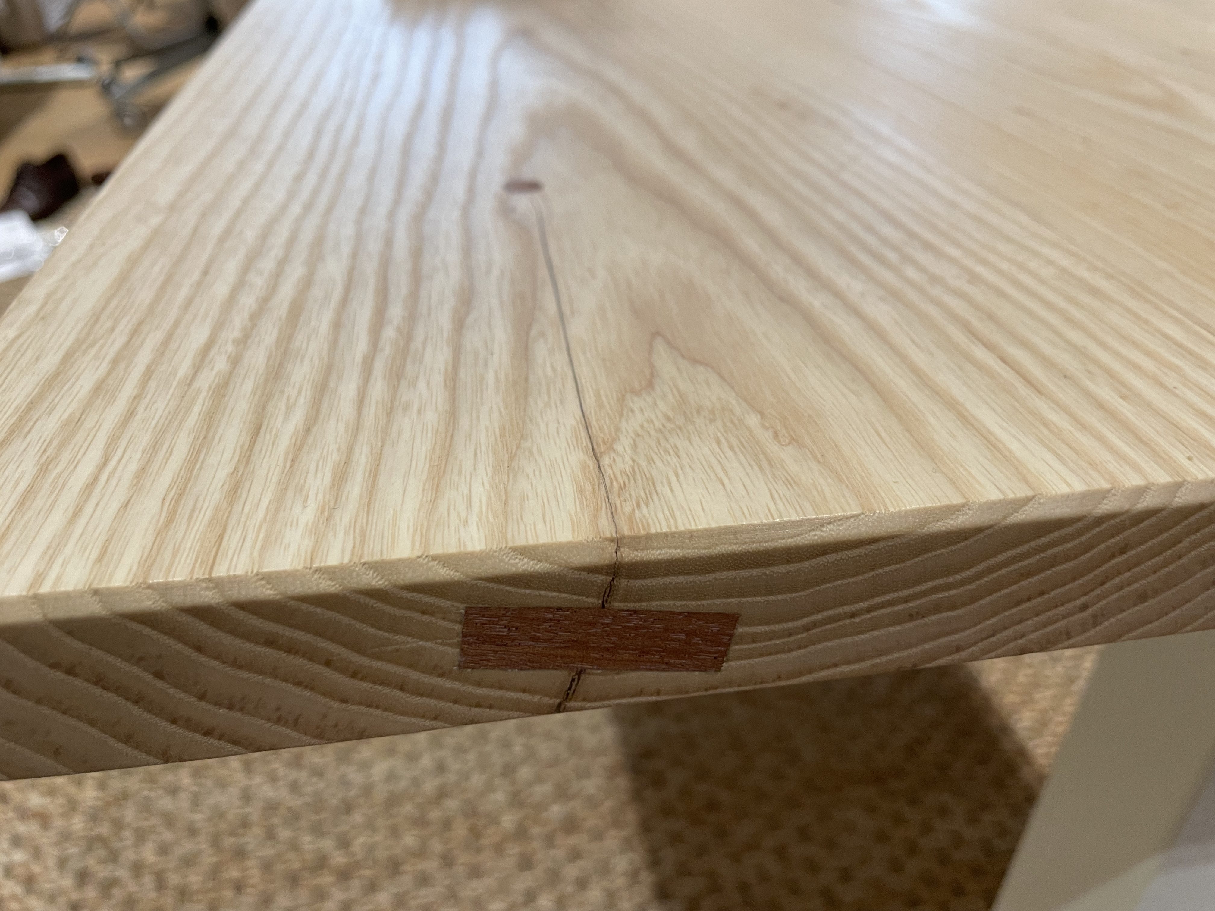 I also added in some plugs at the ends of the cracks. These are pretty easy to do with a plug drill cutter bit (no idea what it’s actually called) and a drill bit of the corresponding diameter. This is how it looked when planed down: