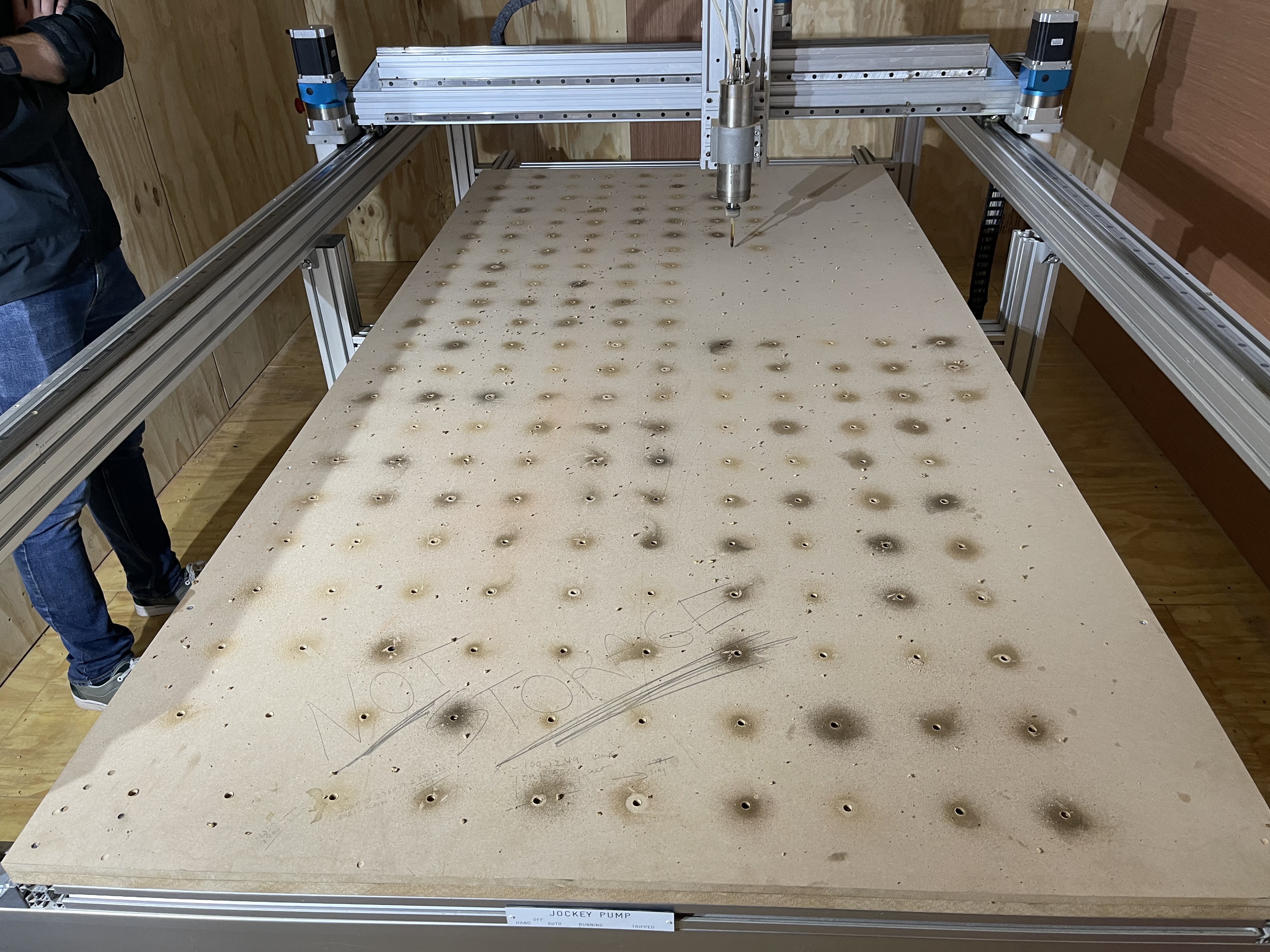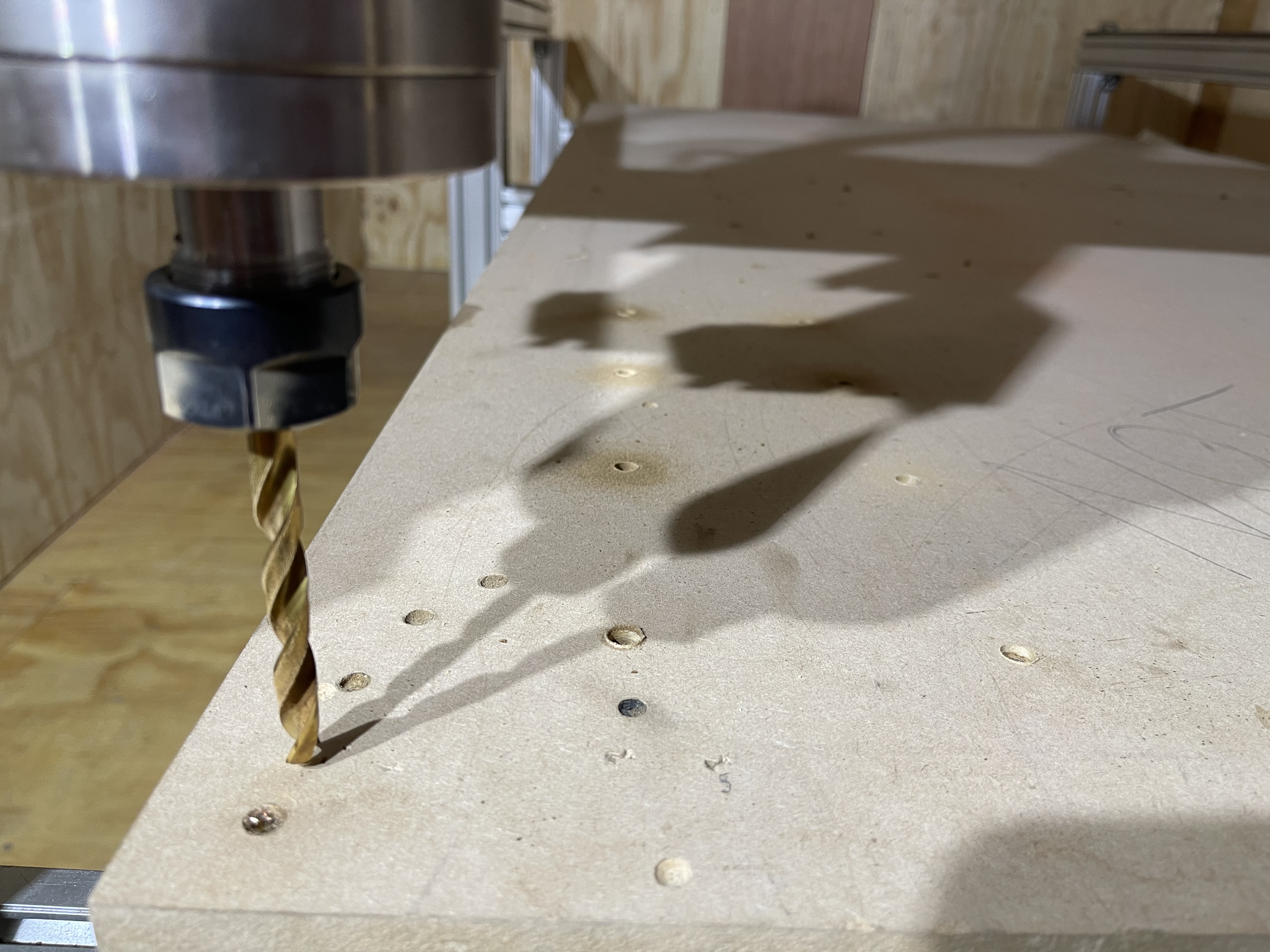 Drilling is not great because the spindle is too fast, but it worked well enough and is easily repeated when we need to change out the top spoil board…