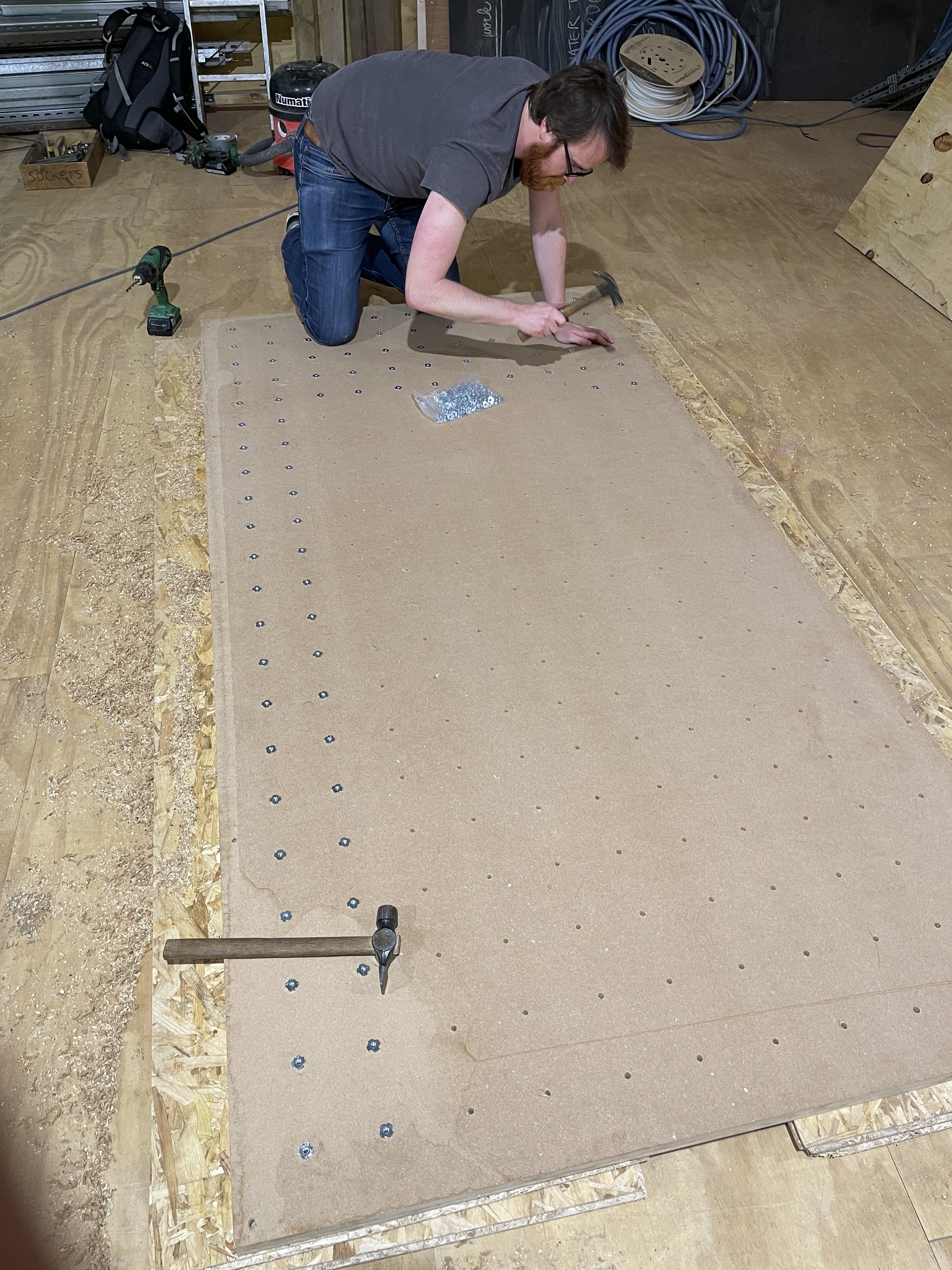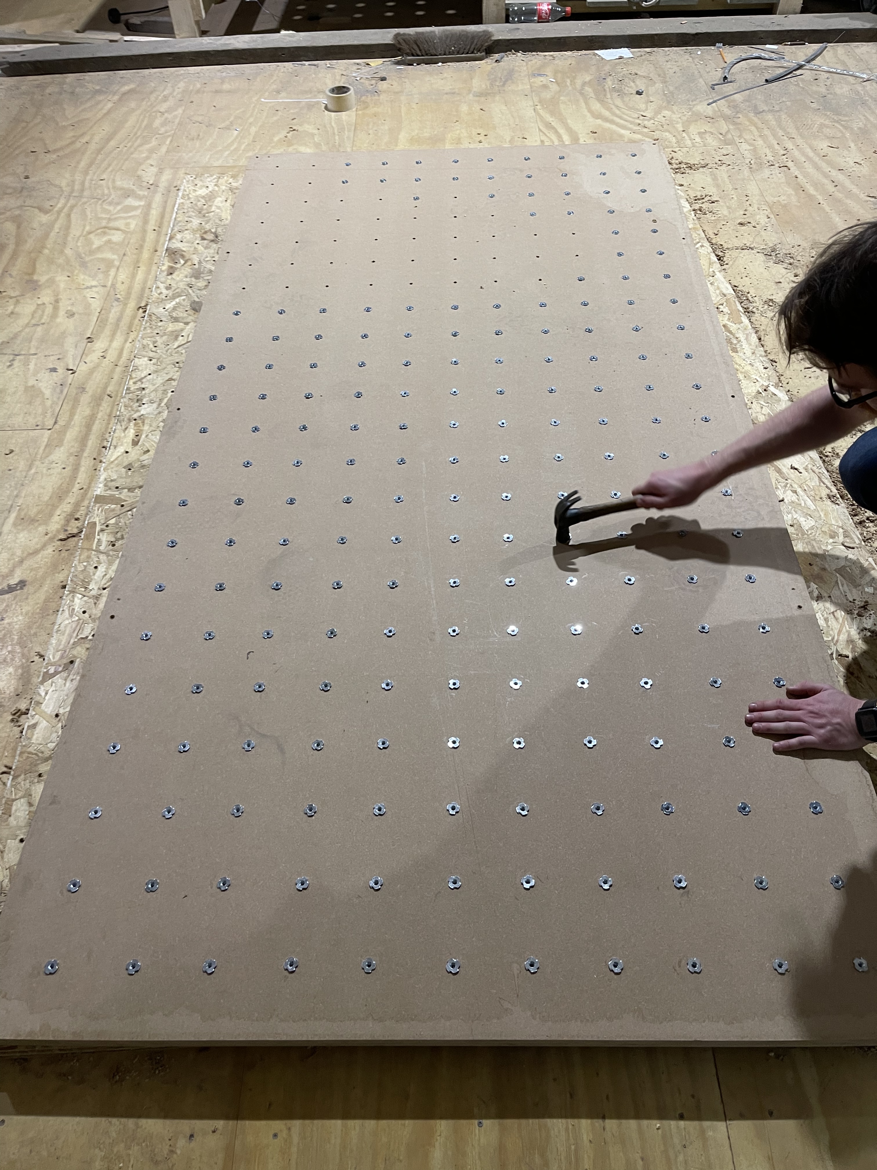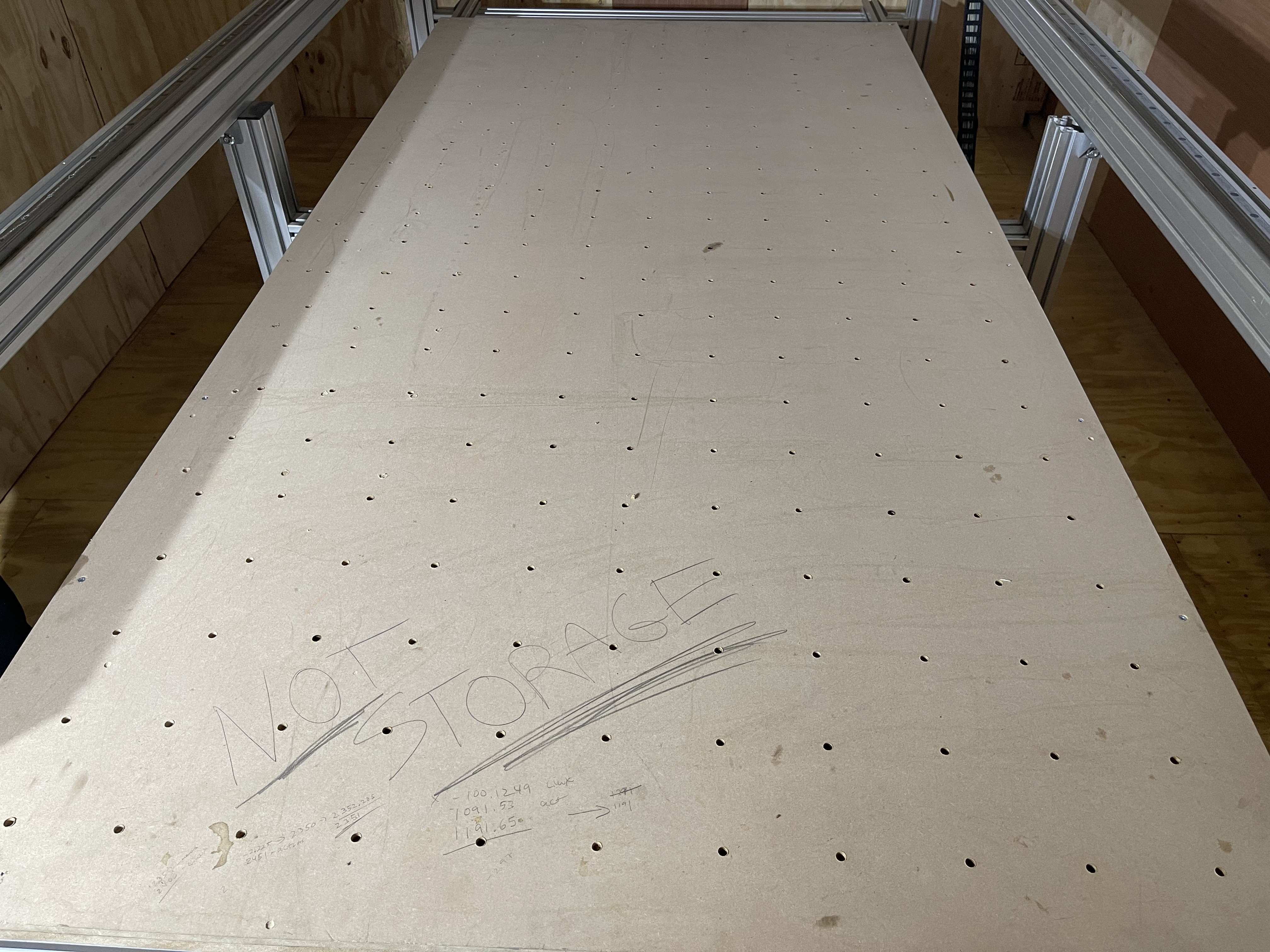 Spoil board has holes! Need to drill them through fully, and mount the nuts in the back, but getting close!