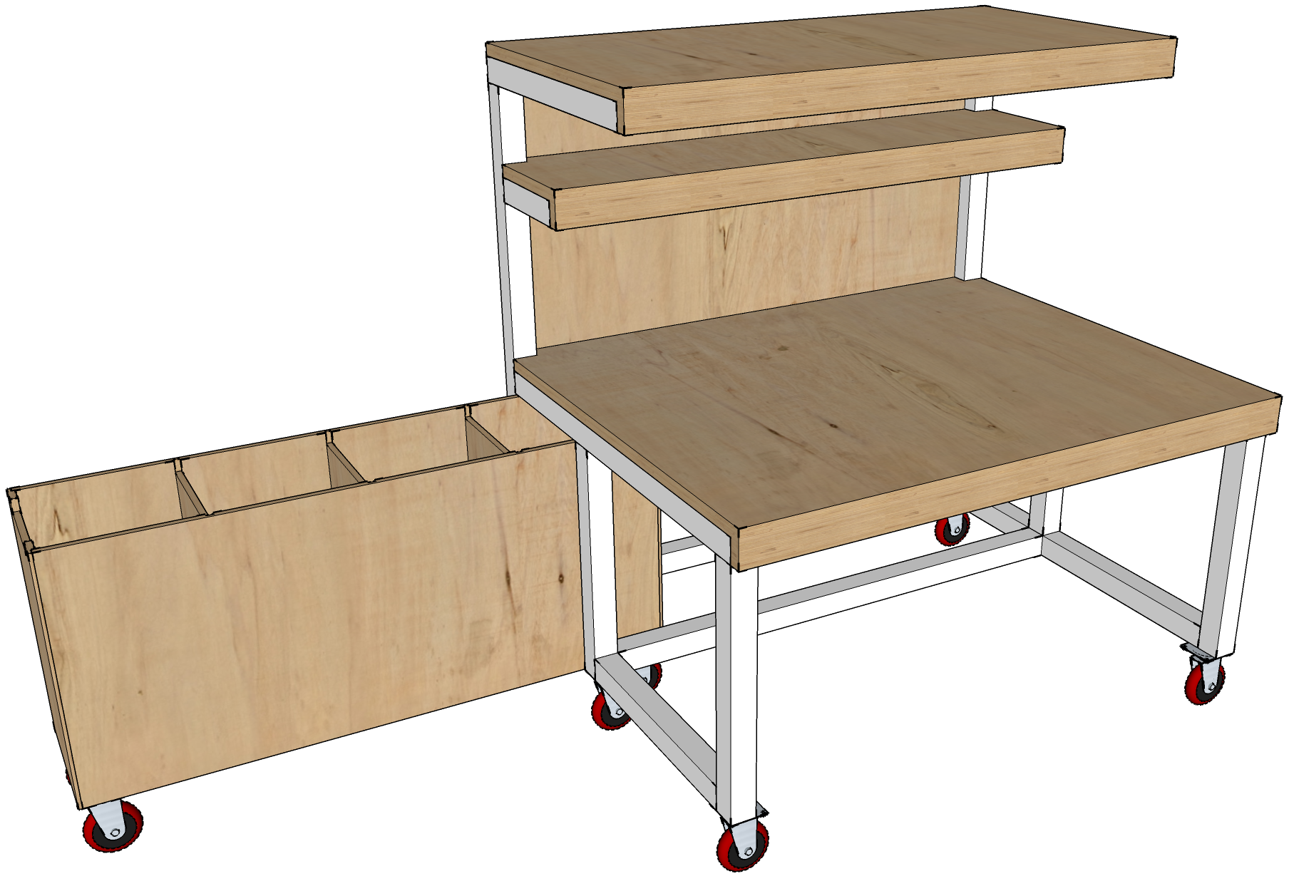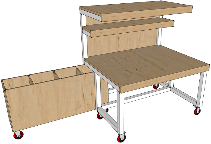 There would be a 2’ top shelf and 1’ mid shelf for equipment. There could also be a storage trolley in the back that slides out.