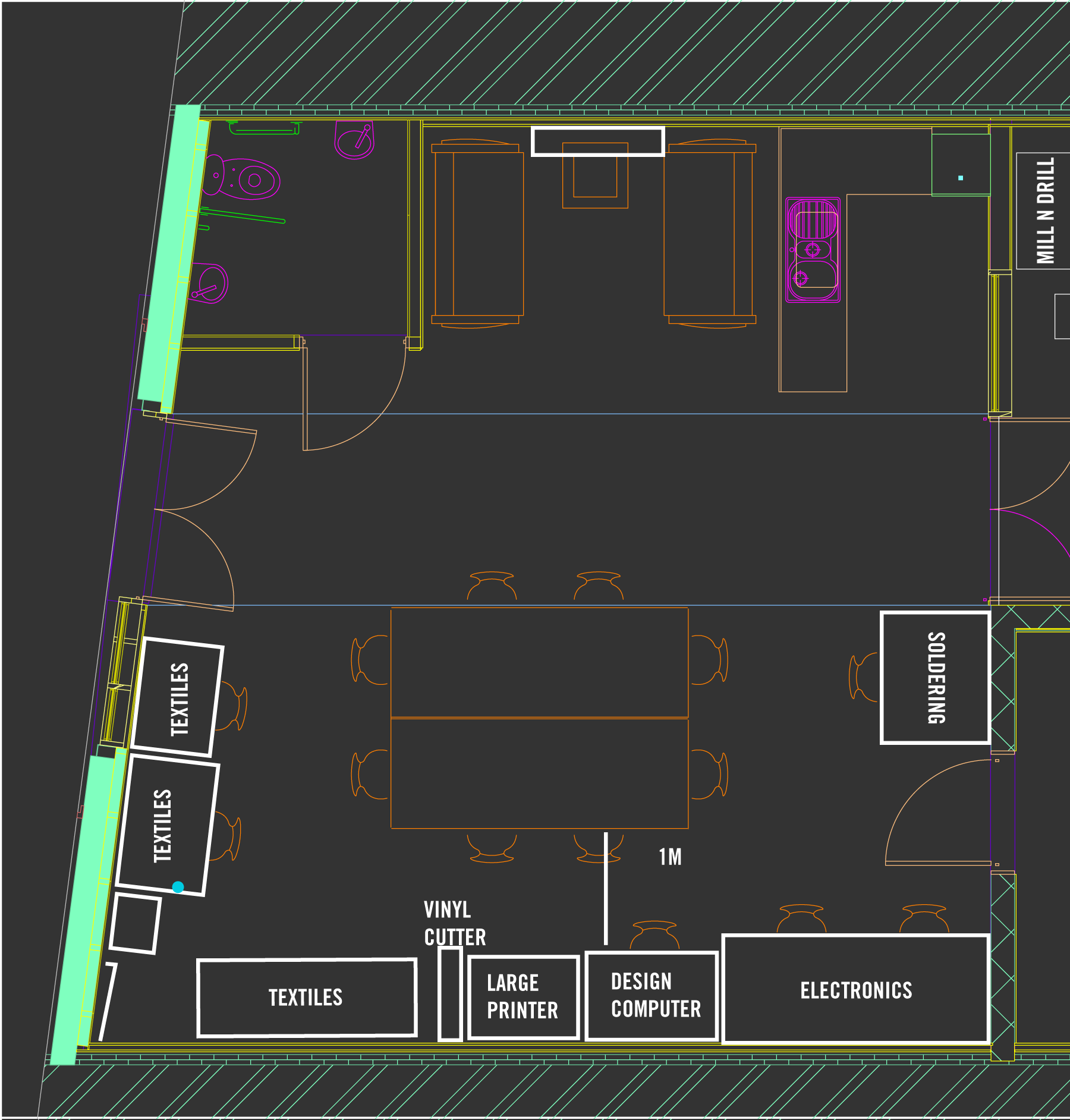 Can’t recall discussing the length of the bench but if we can fit in electro bench, computer / design / CAD station, large format printer and vinyl cutter and textiles get what they need then go for it
