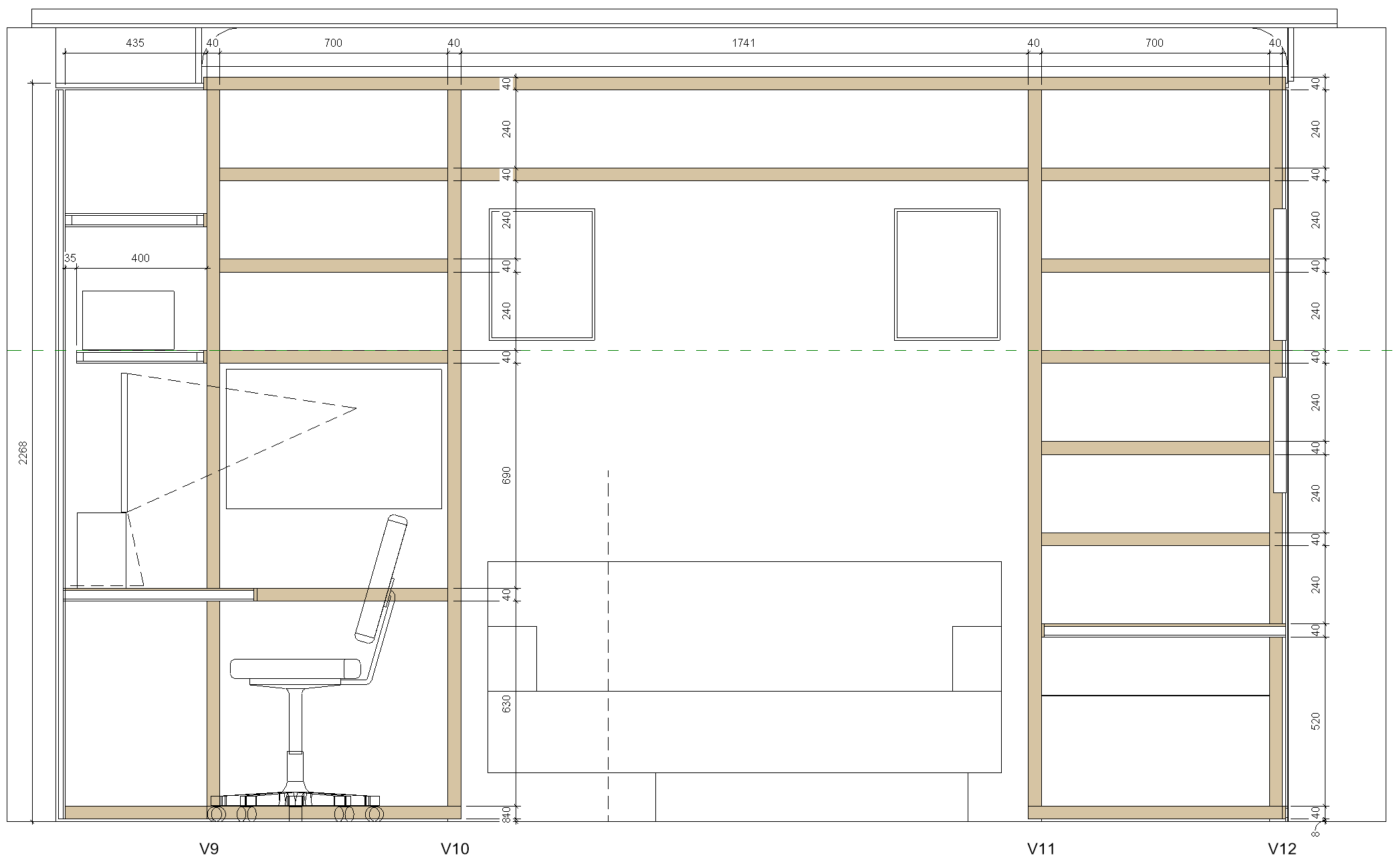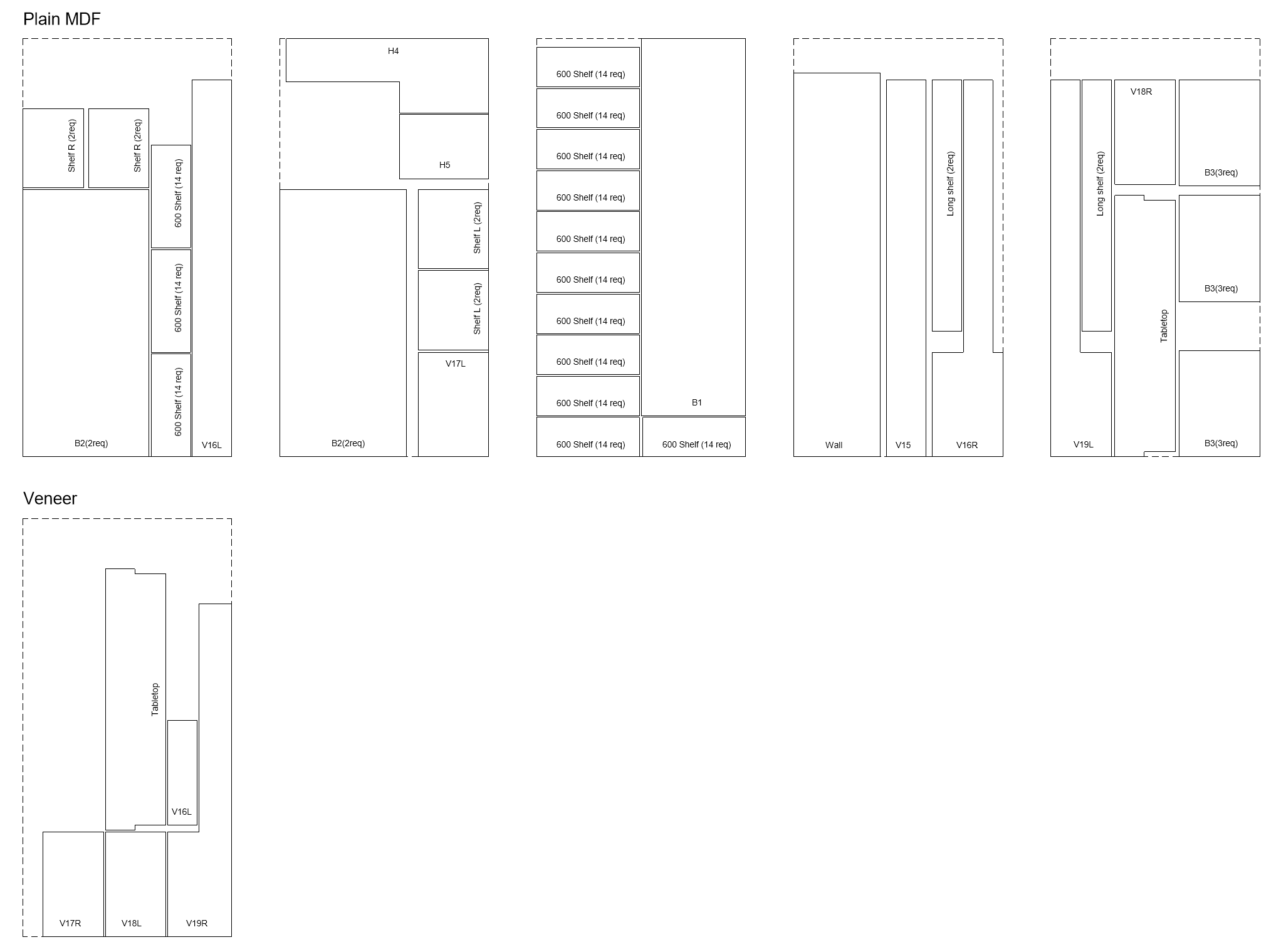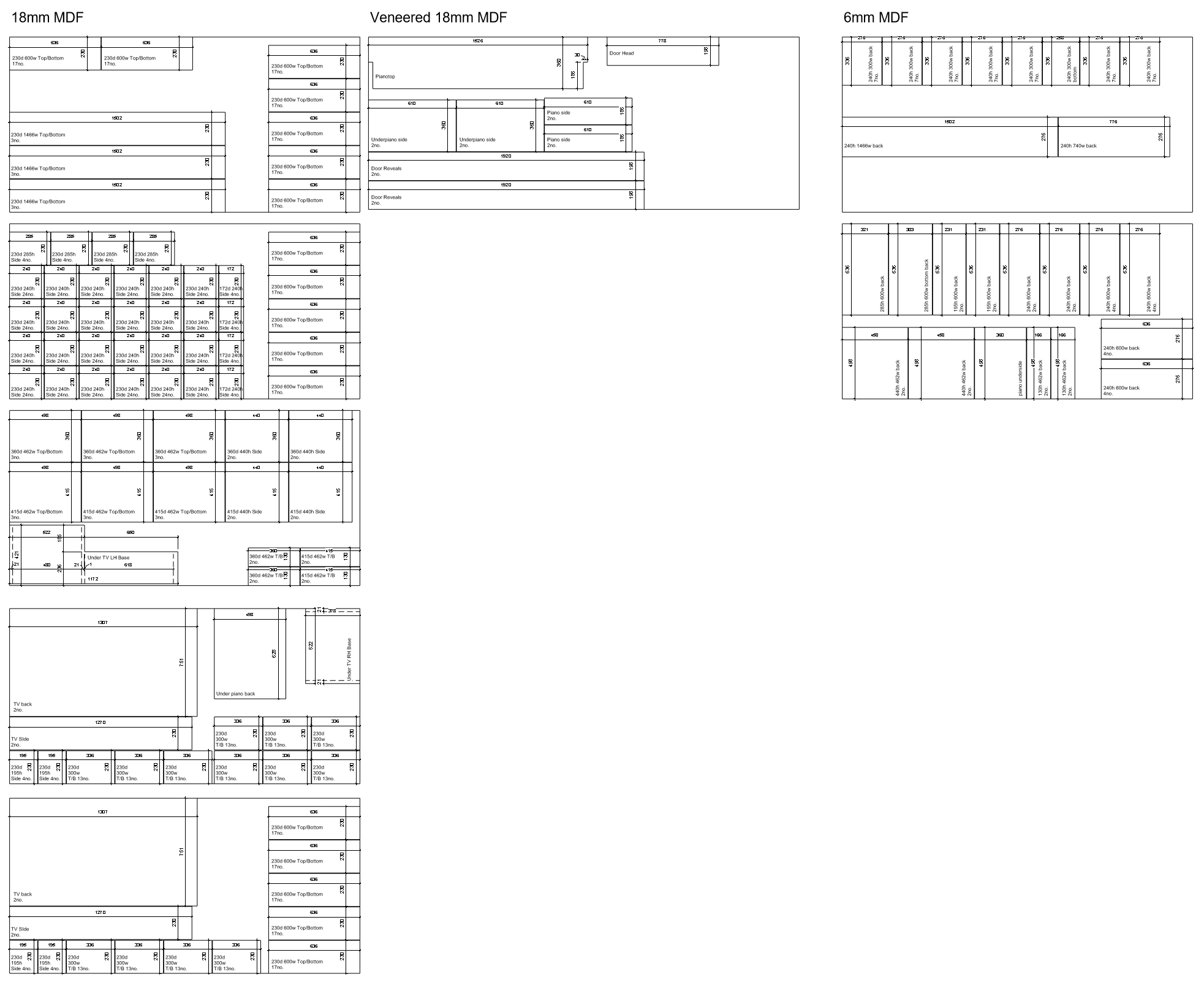 It’ll all be made of MDF-on-framework sandwich panels, oak veneered on the “outside” faces, painted white on the “inside” faces, with solid oak strips to all the horizontals and verticals. I’ll need to get well versed on the panel saw, but it should be a simple matter of making lots of mostly-rectangular bits and then dowelling them together. I’ve got my solid oak parts all scheduled, and my sheets all divvied up for cutting.