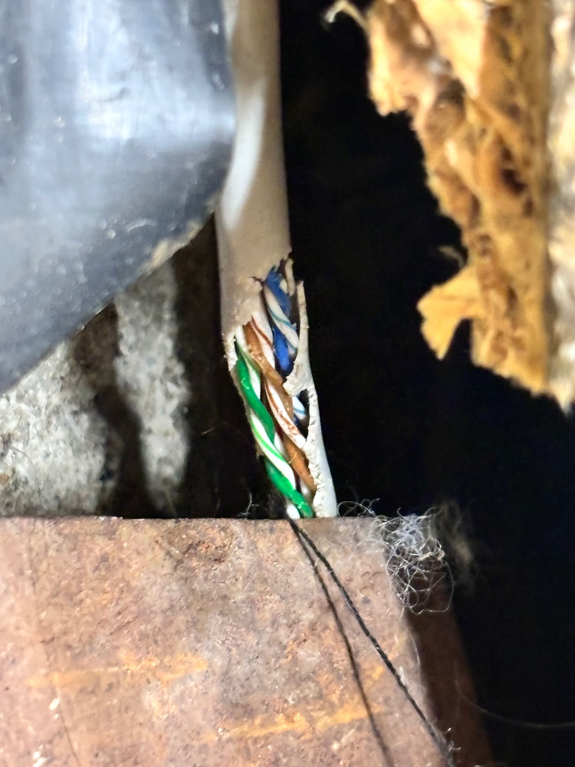 As I was in the textile room today, I noticed that the ETH cable has been damaged. I’m not sure if it was caused by a mouse or the friction from walking on the floorboards. Please see the image attached.