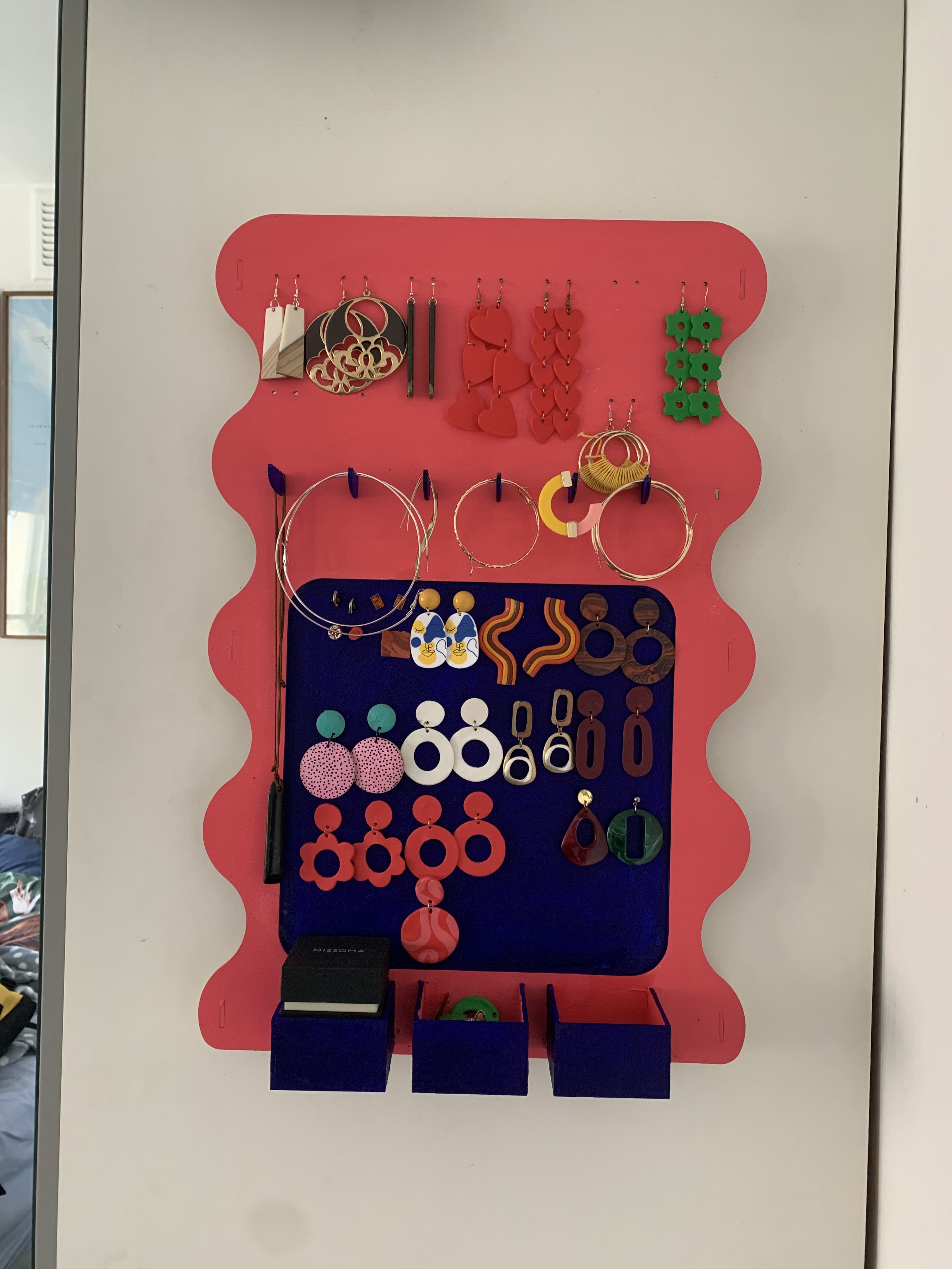 Simple first project with the laser cutter following being inducted, a display for earrings complete with holes for hooks, hooks for hoops and a cork board for pins. This project used exactly one sheet of plywood and used all the material up to which was satisfying. Few bits I would change if I was to do this again but overall very happy with how this turned out! Now to make some more polymer clay earrings to go on it…