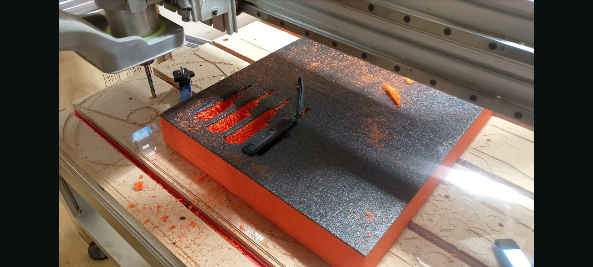 Shadow foam is ace. Easy to use with a scapel, however for the price, its very costly solution. I wouldnt use a cnc as a scapel is just fine for the job. It peels aawy in 10mm layer after the first 5mm black layer. It did a great job keeping my photography gear safe in a peli case.