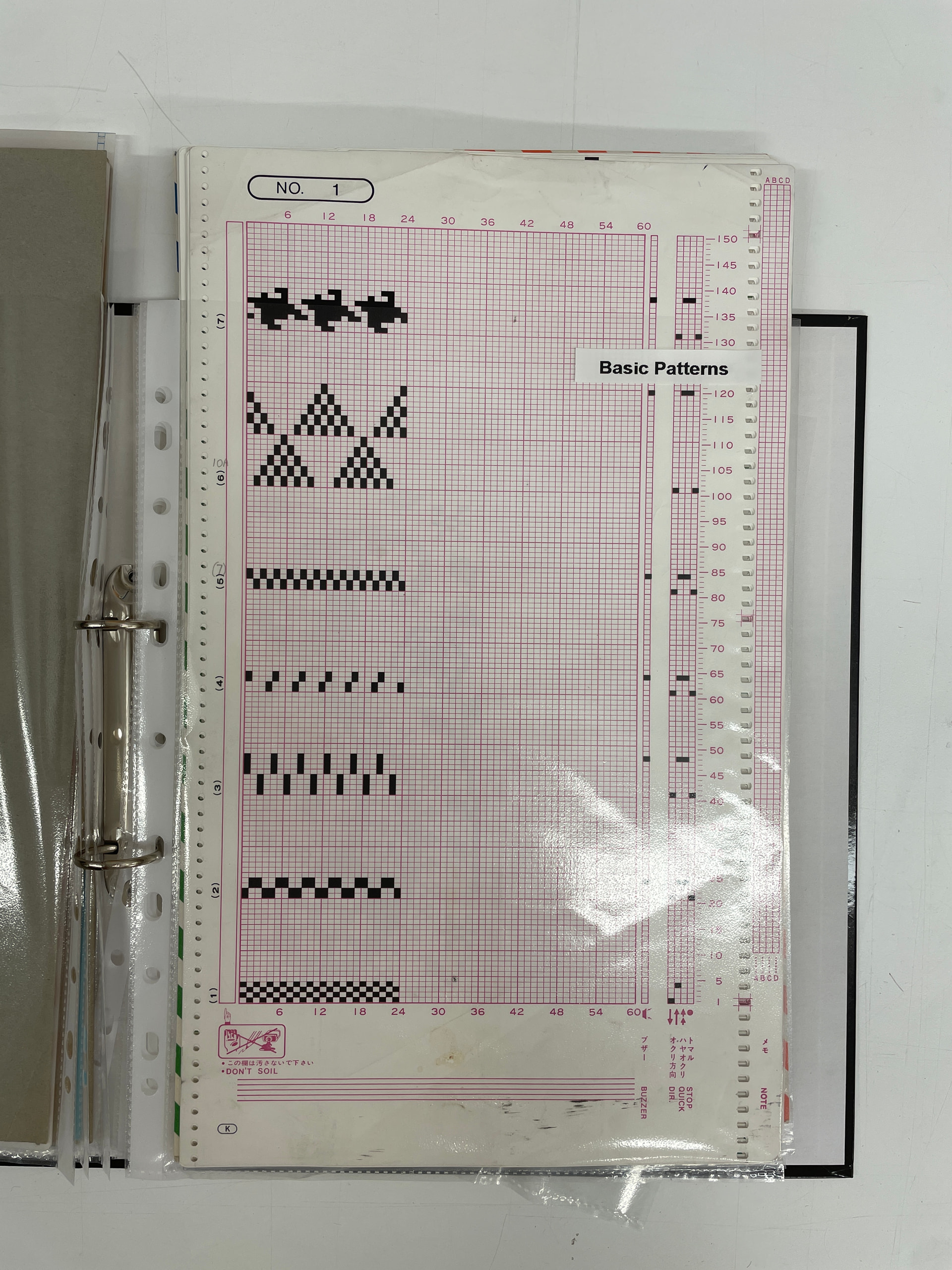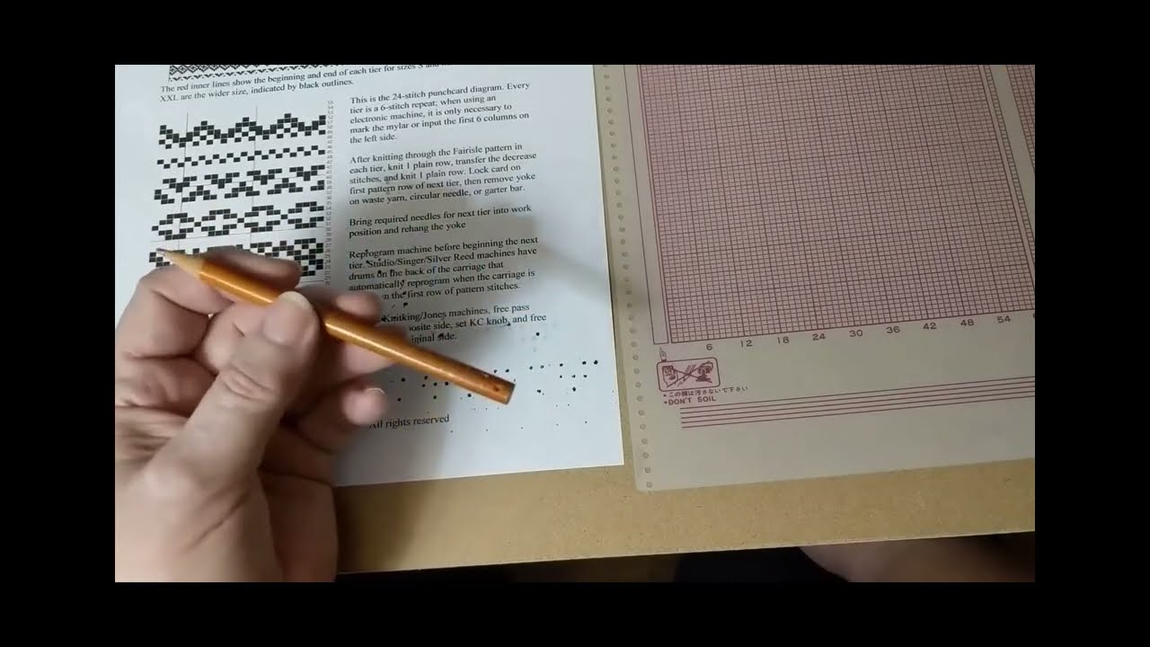 The Knitmaster uses mylar pattern sheets, which are no longer mass-produced by the original manufacturer (Silver Reed). Companies like Andee Knits are authorized dealers for Silver Reed/Knitmaster parts and sometimes stock both pre-printed and blank Mylar sheets for the EC1, and eBay and Etsy often have listings for both pre-designed sheets and blank sheets for custom designs.
