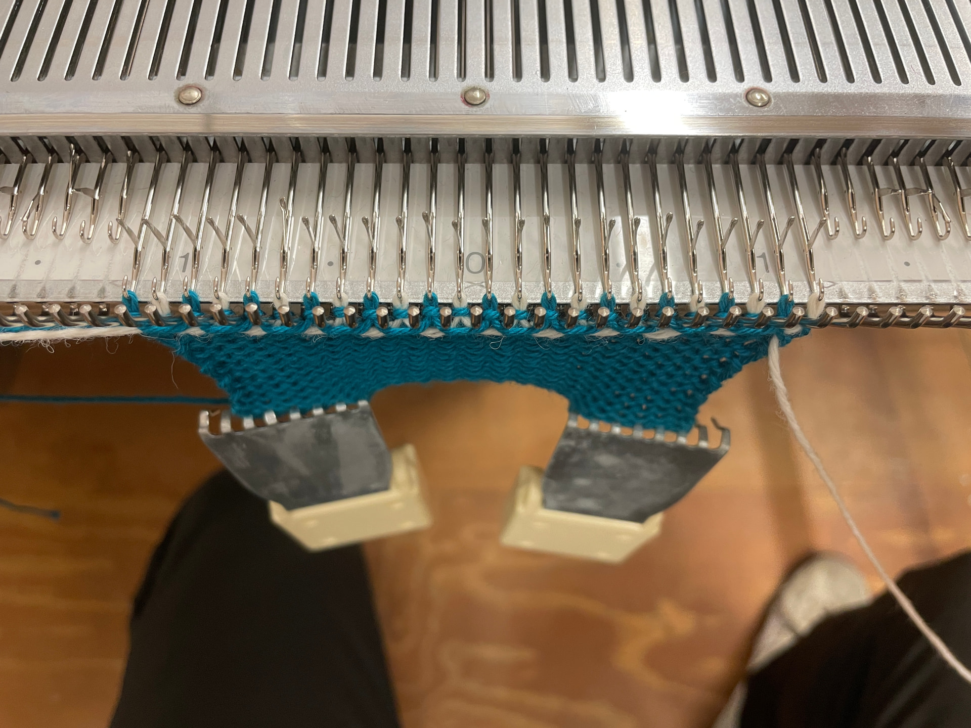 You can use yarn separators (in the ‘Knitmaster Accessories’ box) to ensure the main yarn and the contrast colour yarn don’t cross over one another. After each row, make sure the main yarn (blue) is above the separator, and the contrast yarn (white) below: