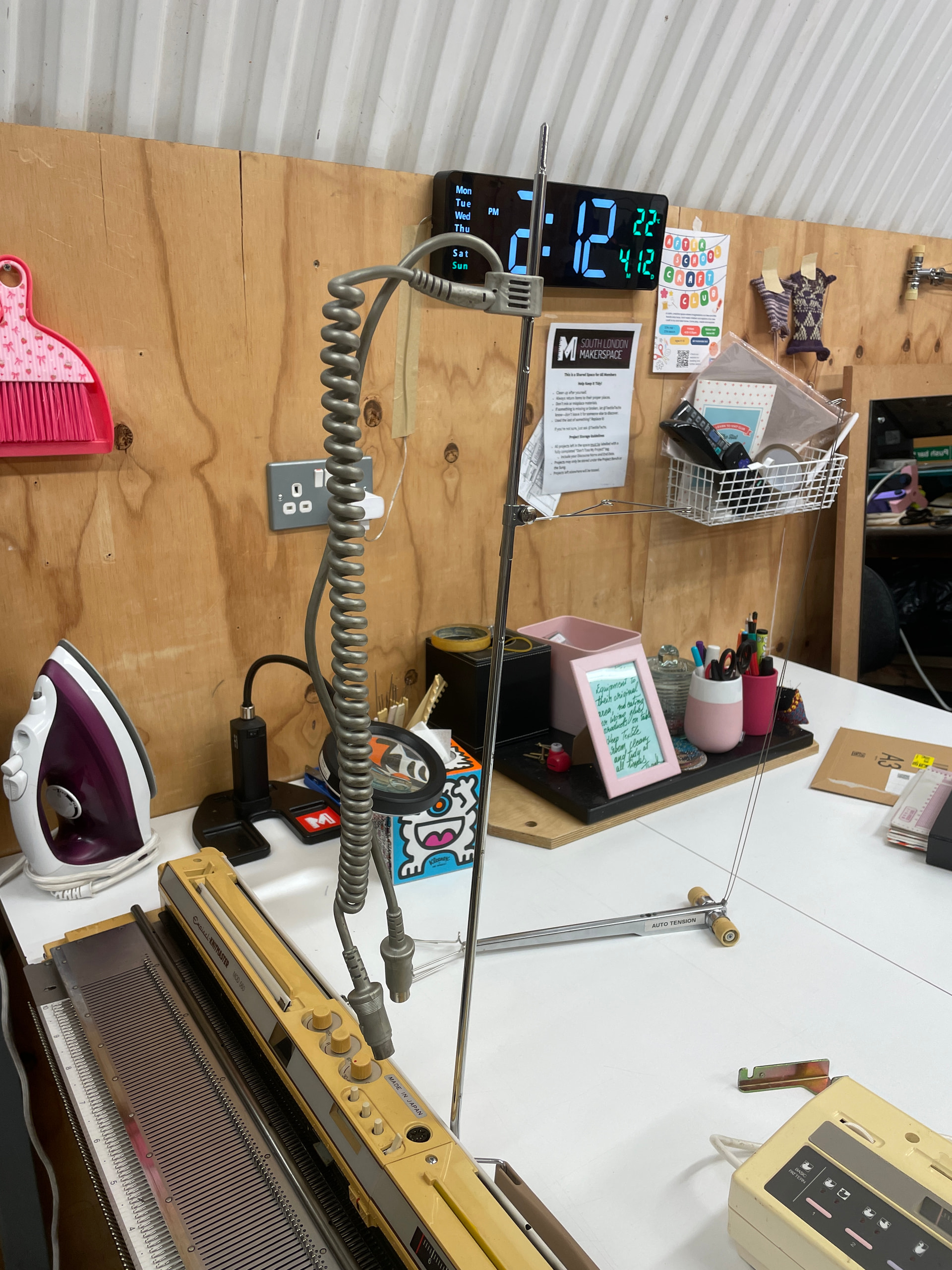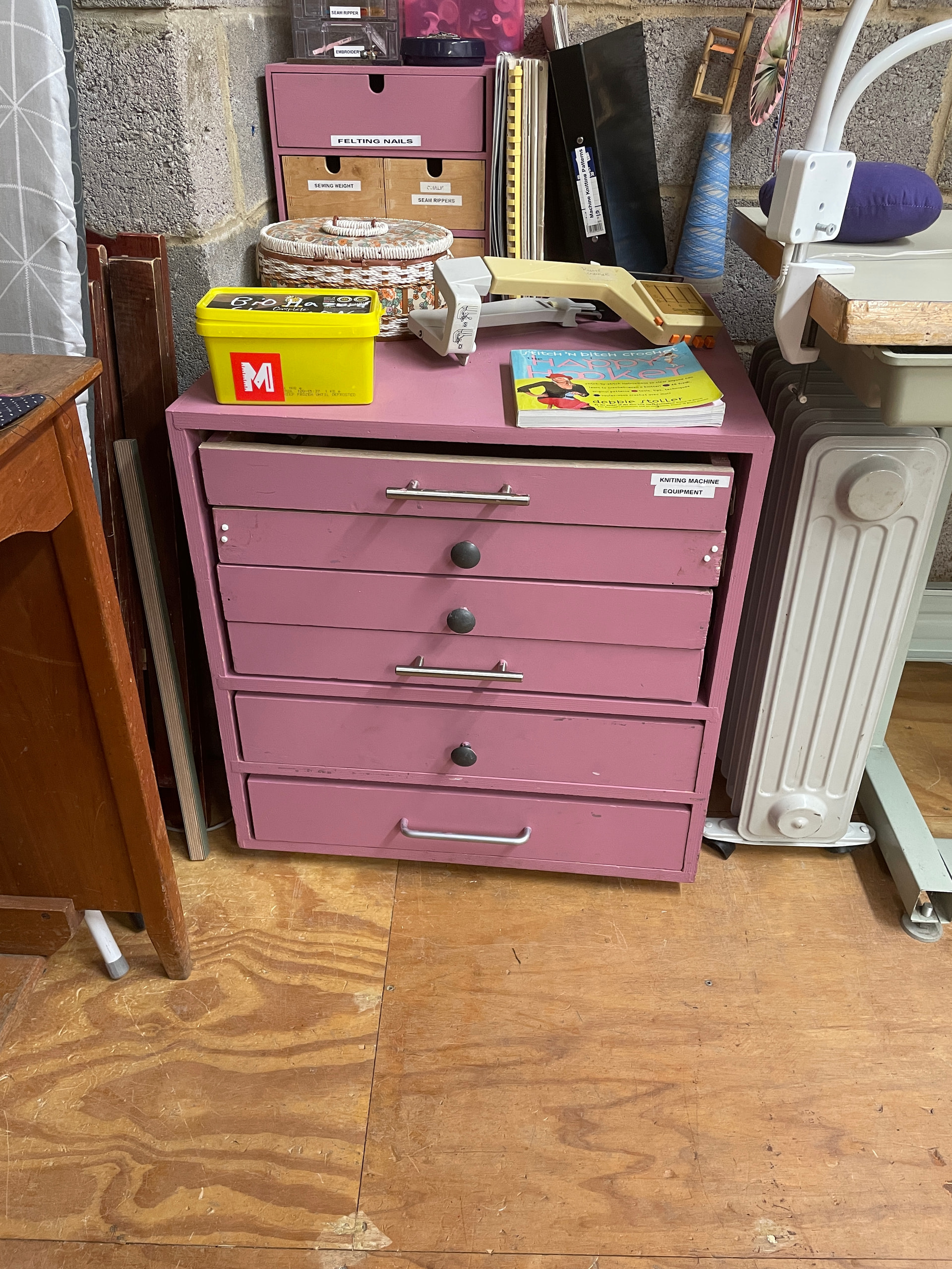 Accessories can be found in the purple chest of drawers labelled ‘machine knitting equipment’: