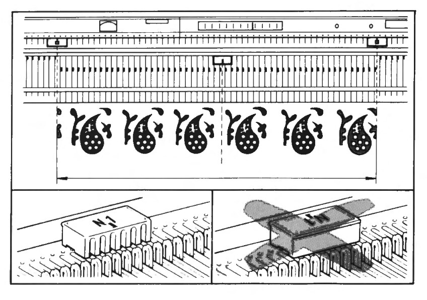 The two white horizontal scroll wheels are used to set the beginning and end of the pattern - in this example, the pattern is 24 stitches wide, so the beginning is set at 0 and the end is set at 24. Buttons 1-5 are used to invert, flip, elongate or mirror the pattern, and button 6 is used for double bed jacquard patterns only.