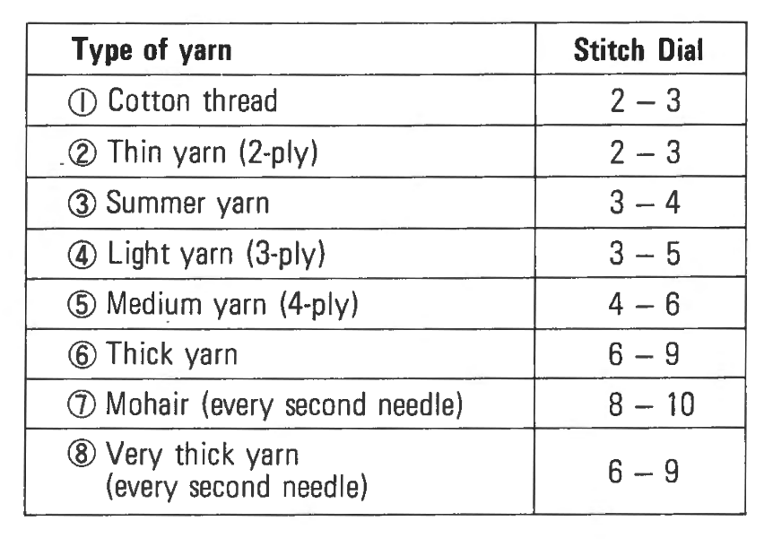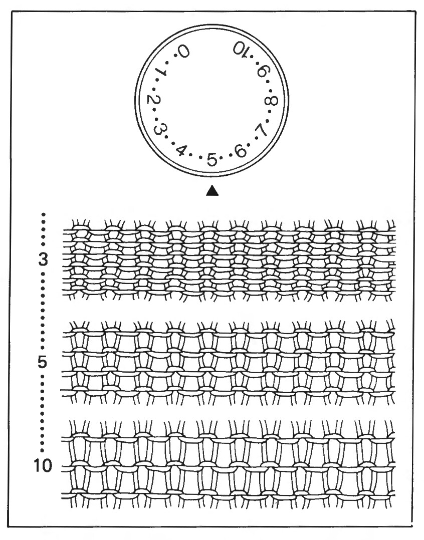 Set the stitch dial (the large dial in the centre of the carriage) to an appropriate number for the type of yarn you’re using (see page 10). The larger the number, the larger the stitches that form: