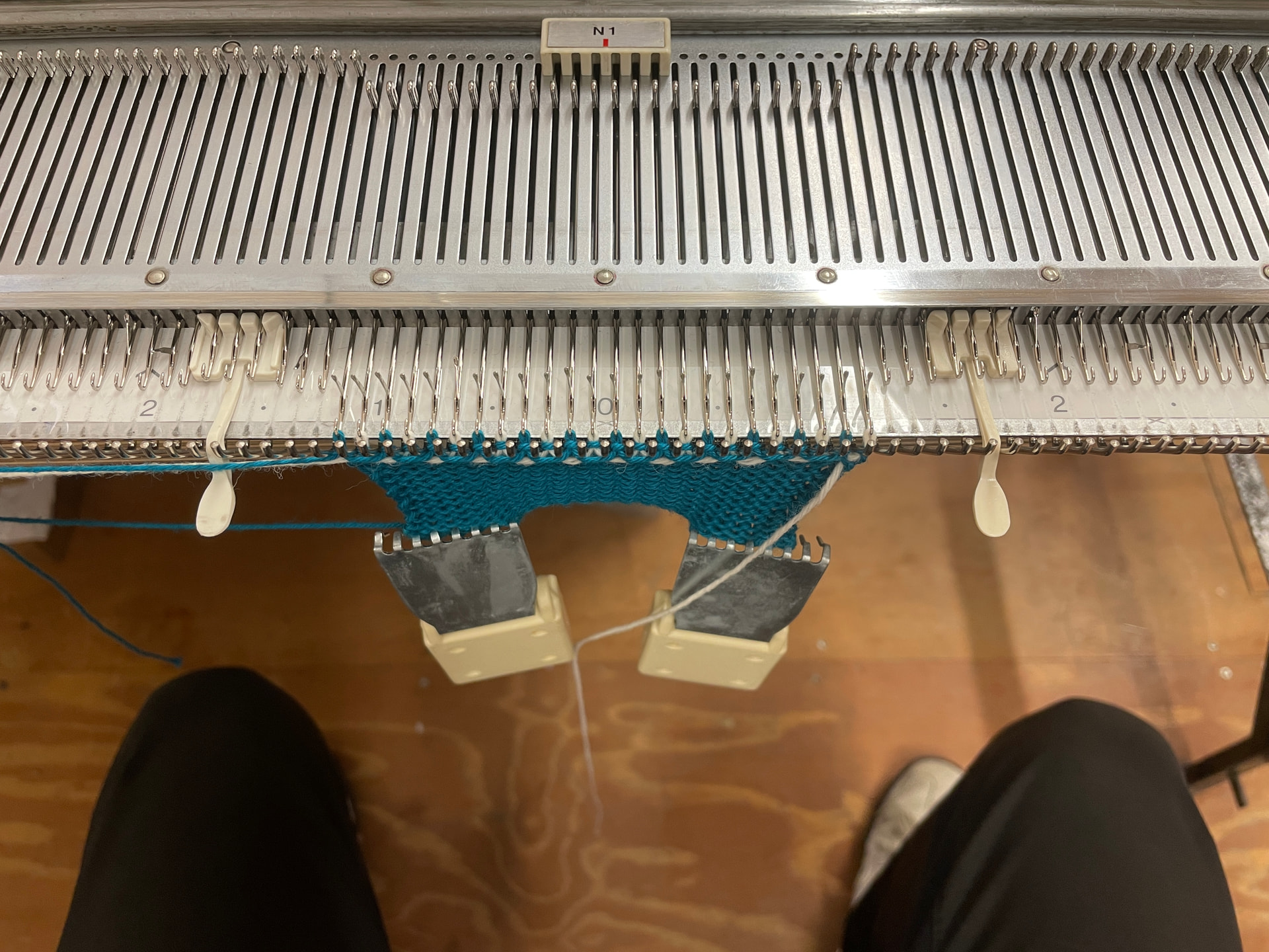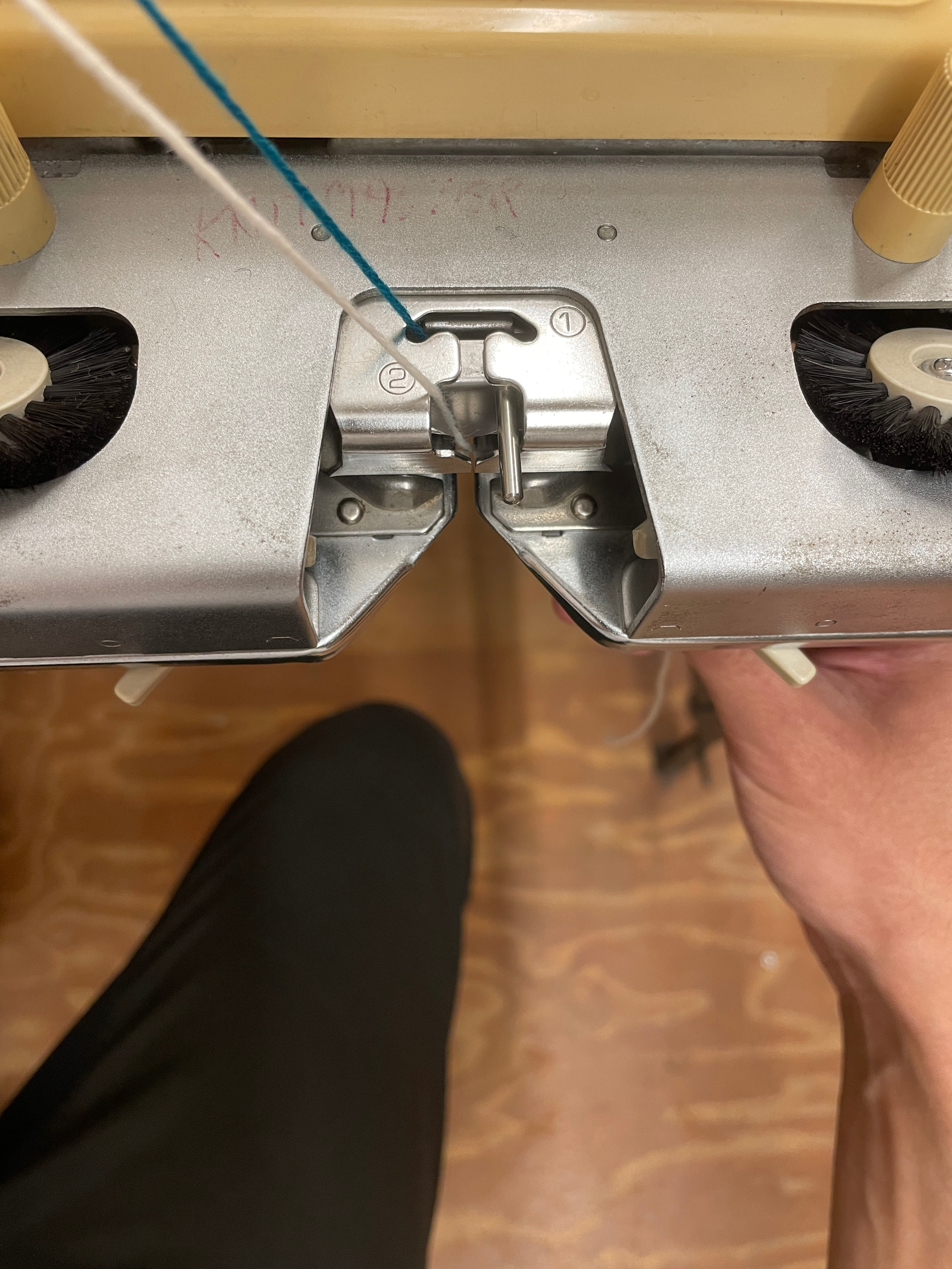 The operation manual (p. 11) shows the woven cast-on technique, which is quick, but can leave an untidy edge. A cleaner and more secure cast-on technique is the e-wrap cast on, which involves wrapping the yarn around each needle like the letter ‘e’ before securing it in the yarn feeder.