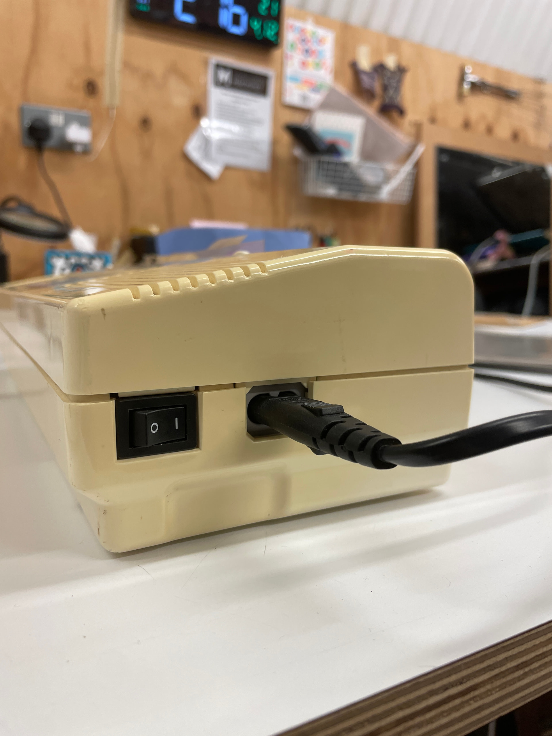 Plug a power cable in to the machine and switch the power on: