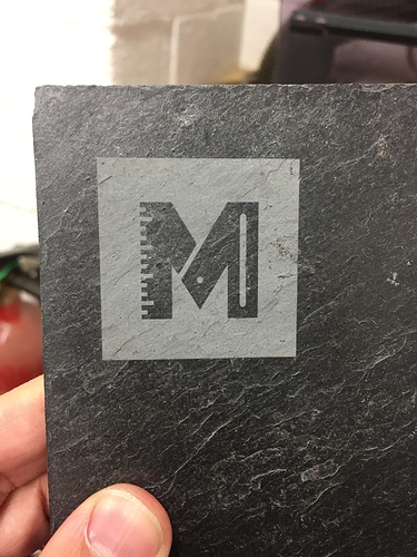 Chose Stone from the cutting default list and granite as the sub-material. Then set power at 34 and speed at 100. Unsure of the dpi. Whatever was the default for granite. Only did one pass. Gonna have another go today. Maybe drop the power and give it two passes. See if I can get a bit more depth to the etching. I scrubbed the slate a little and you lose some clarity. It gives it a nice little bit of character, but I worry you could lose the pattern completely over time if you don’t get it etched a little deeper.