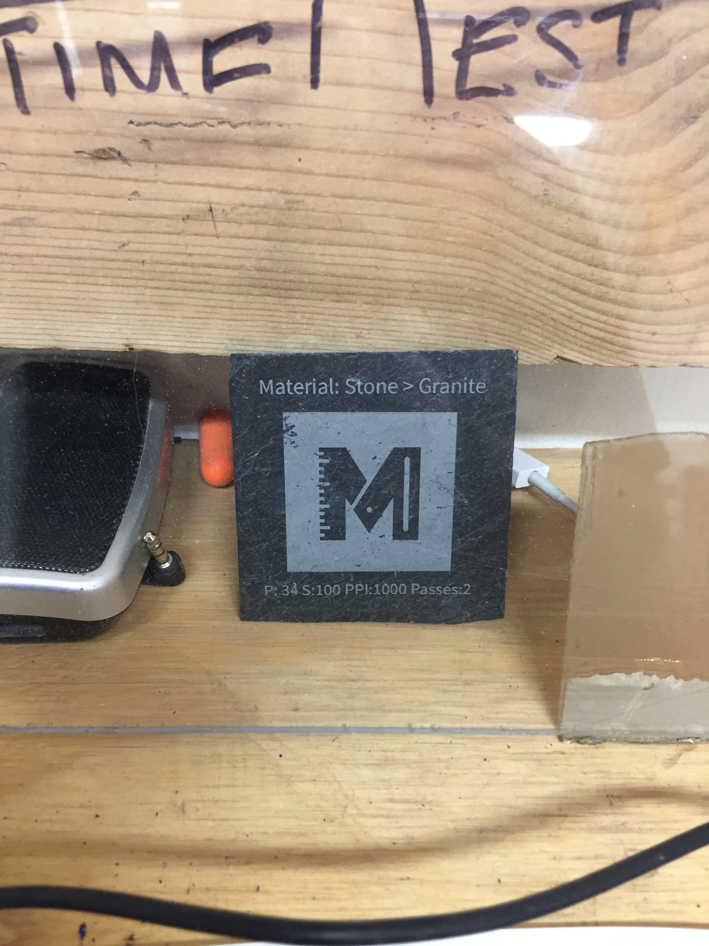 Makerspace logo 2 passes at 20 power and 100 speed. Then went over it at 30/100 for 1 more pass.
