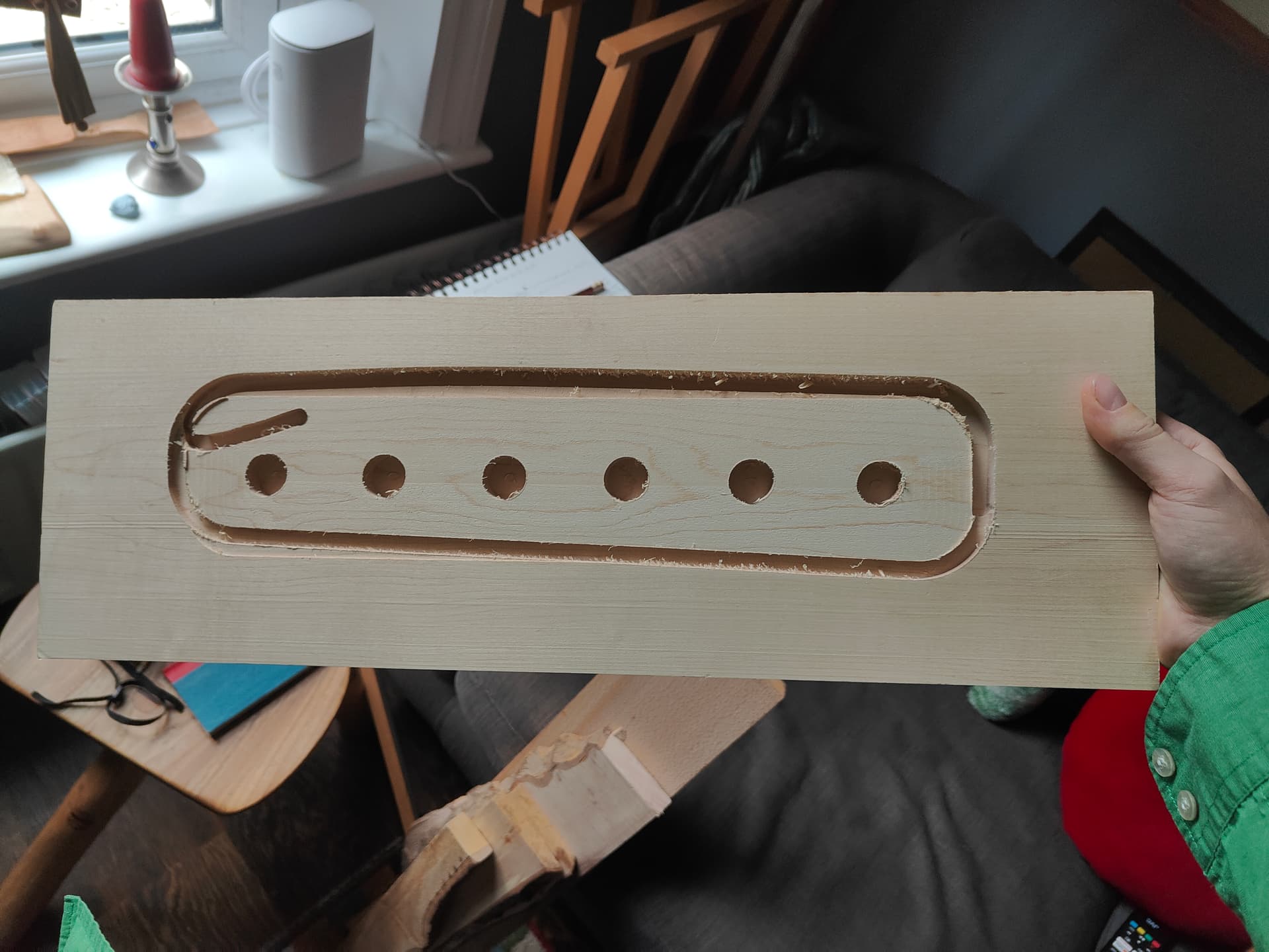 The crux of the project was needing to bore holes with a perfectly flat bottom, leaving wood to the thickness of 2mm for the magnets to be glued into. No drill bits I know of fit the bill for the job, and it was a great excuse to get stuck into the CNC.