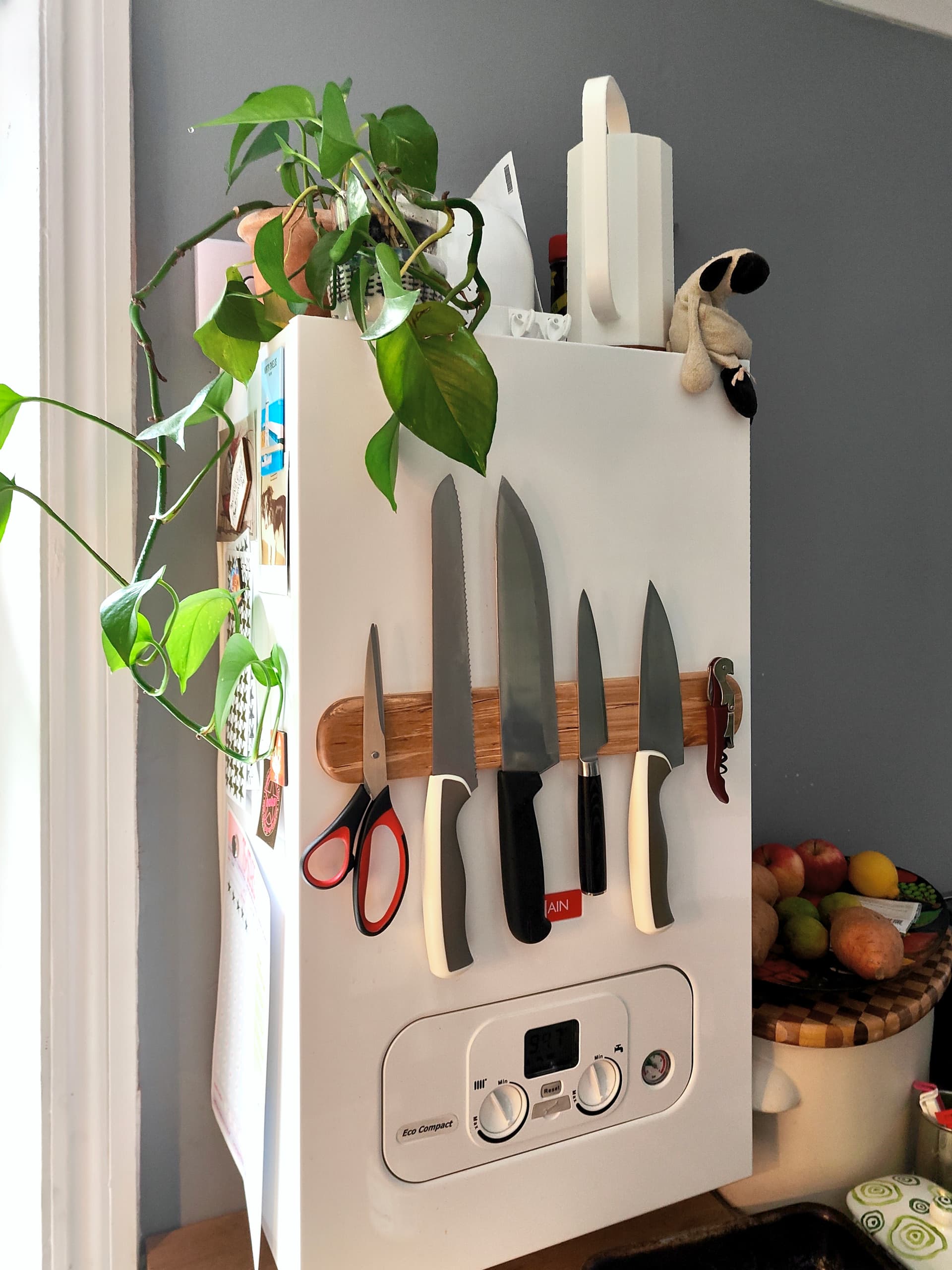 It’s a magnetic knife rack, made to attract to the metal case on the boiler in my kitchen, which takes up a tonne of counter space.