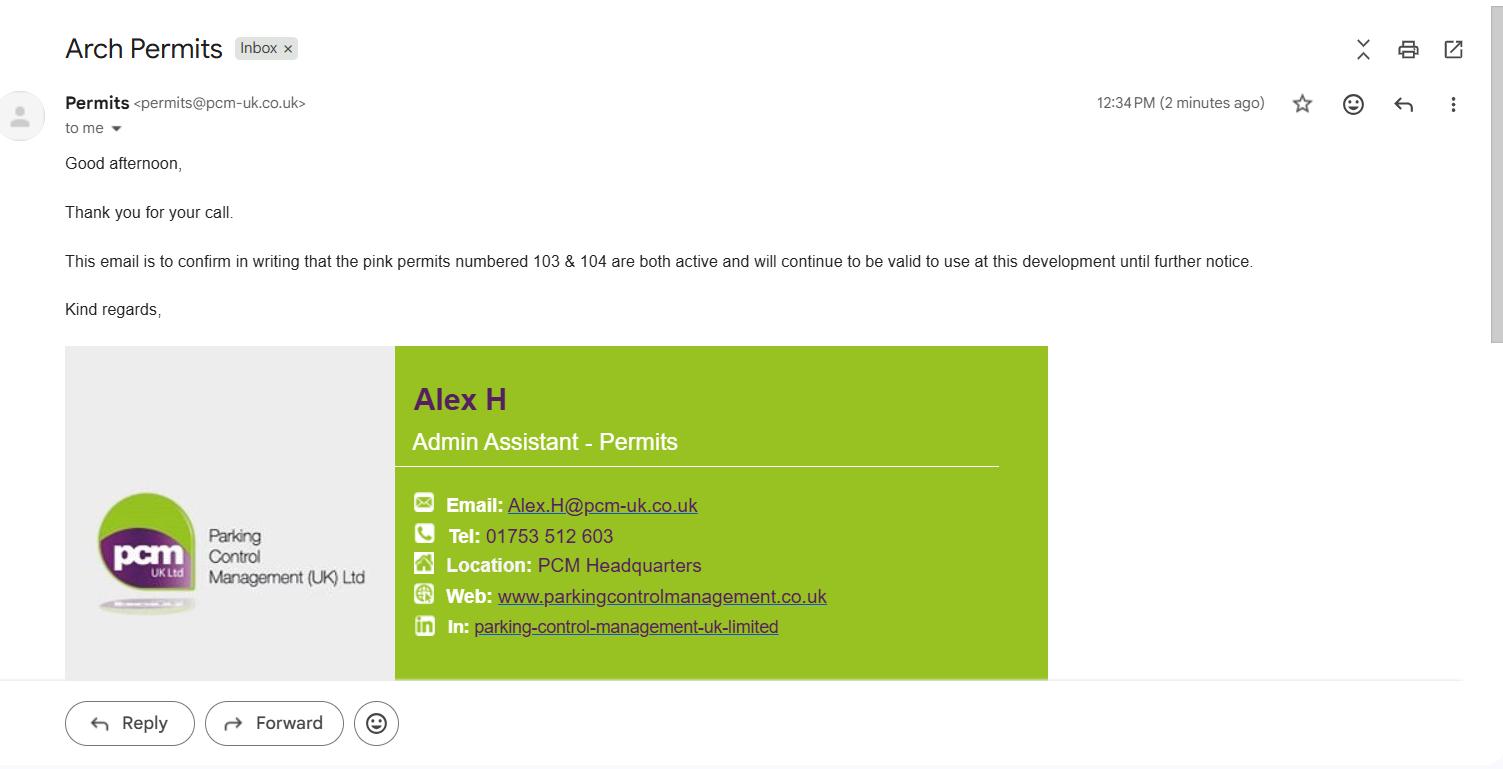 I explained the situation, he looked up our file and confirmed with 100% certainty that our permits are not invalid. Archo Co has not reached out to them, to cancel/invalidate ours, and if they did the parking permit team would have to give us written notice and warnings before enforcement comes into effect.