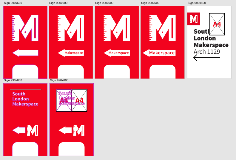 If we really want to embrace temporary text, then the bottom approach might work. ‘South London Makerspace’ in big, cut in text that can have an A3 sheet in front when needed.