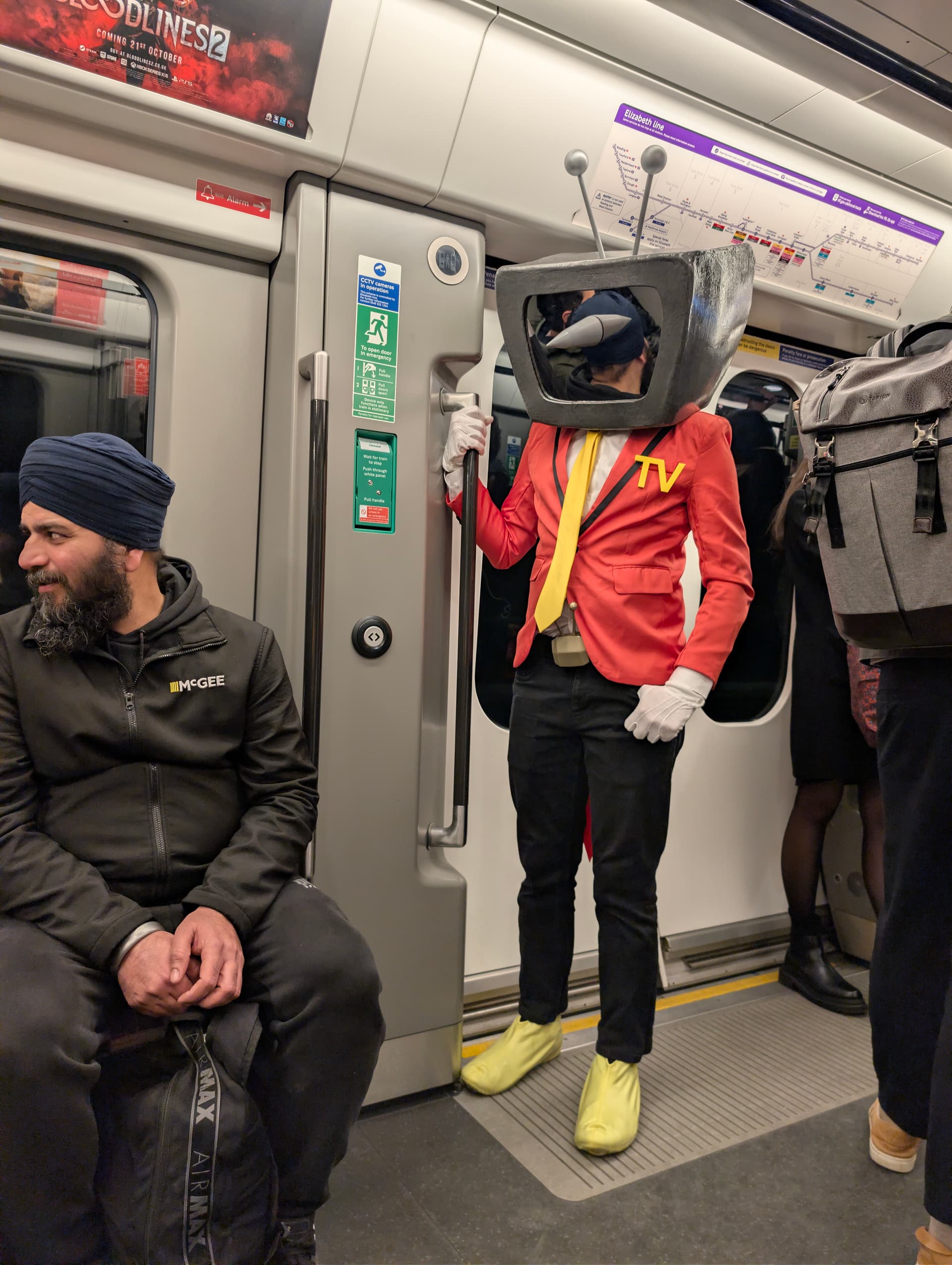 The head was made with some left over foam, flexi-paint, and some one-way mirrored acrylic I can see through. There were some electronics in there that should have displayed different facial expressions, but I had some issues not long after I turned up. I’ll design a new circuit for the next one to fix it.